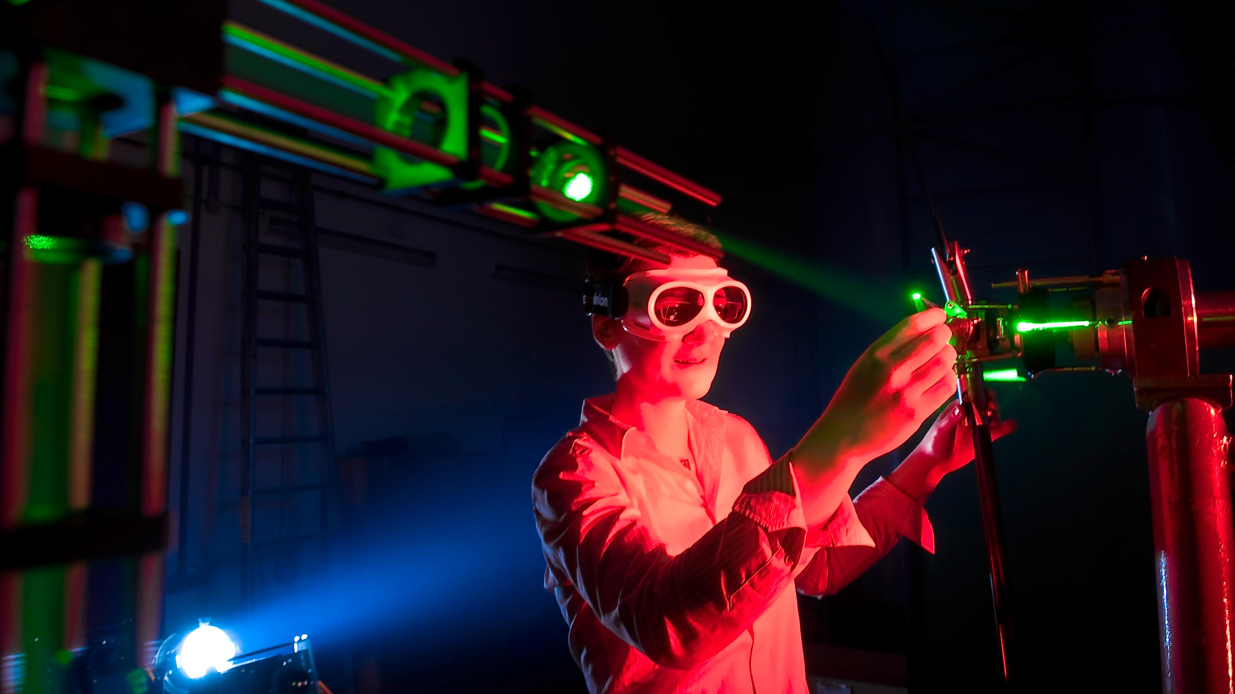 Mit Laser und Hochgeschwindigkeitskameras dem Rotor-Lärm auf der Spur: Dr. Karen Mulleners vom DLR Göttingen justiert das Modell eines Hubschrauberrotors für die Messung.
