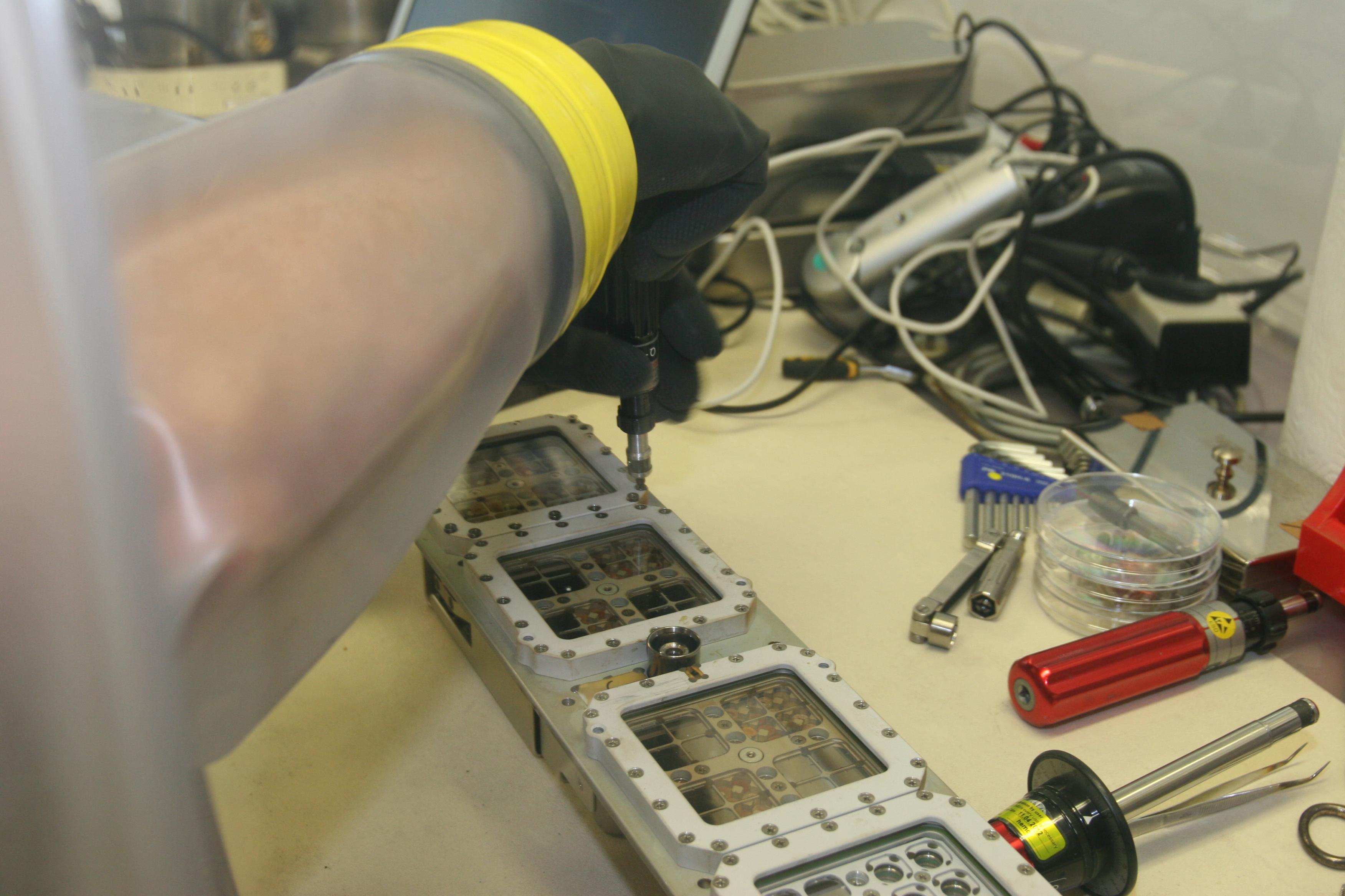 Ein Teil der Proben wurden im Versuchsträger einer Atmosphäre aus Edelgas ausgesetzt, ein anderer Teil dem Vakuum. Während einige der Glasträger mit jeweils zehn Millionen Sporen nur durch eine acht Millimeter dicke, spezielle, sehr UV-durchlässige Scheibe der UV-Strahlung ausgesetzt waren, erhielten andere eine verminderte Strahlungsdosis durch optische Filterscheiben. Mikroorganismen, die auf den unteren zwei der drei gestapelten Versuchsträger aufgebracht waren, blieben von der extraterrestrischen UV-Strahlung ganz verschont. Darüber hinaus stellten die Forscher auch unterschiedliche Szenarien mit dem Meteoritenstaub nach - einige Mikroorganismen wurden mit dem Staub bedeckt, andere mit ihm vermischt.