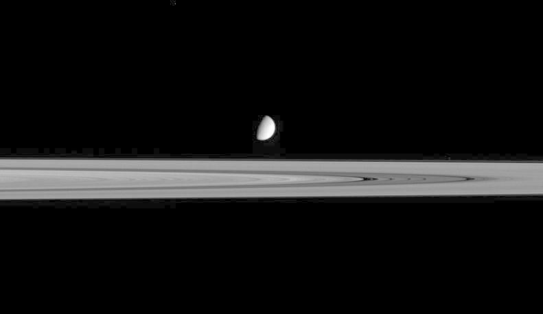 Der Saturnmond Enceladus "schwebt" über Saturns B-Ring. Aufnahme vom 15. September 2005 aus einer Entfernung von etwa 2,3 Millionen Kilometer. Bild: NASA/JPL/Space Science Institute.