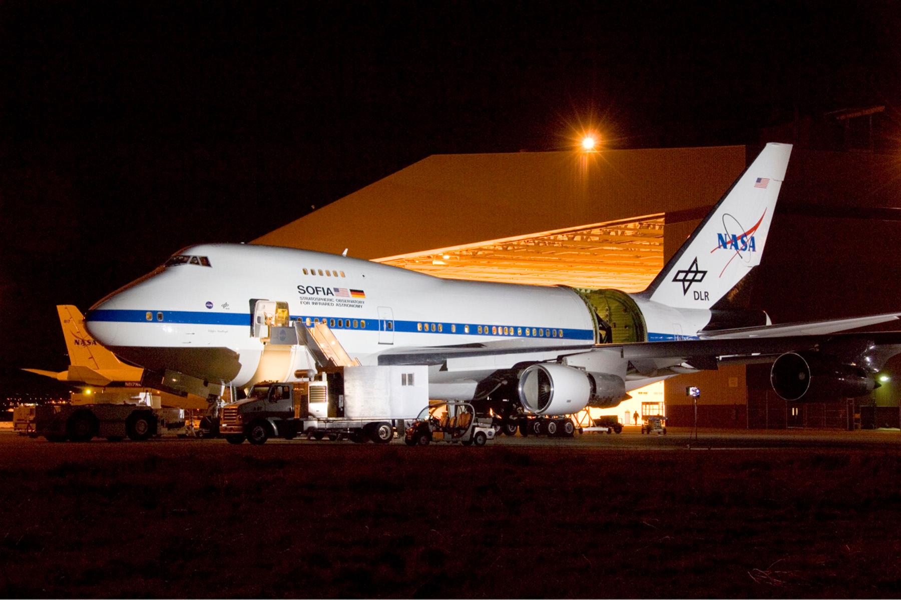 Das fliegende Infrarot-Observatorium SOFIA vor dem Hangar der Dryden Aircraft Operation Facility (DAOF) in Palmdale, Kalifornien. Das DAOF wird vom Dryden Flight Research Center der NASA betrieben. Die Aufnahme entstand während nächtlicher Testbeobachtungen im März 2008.