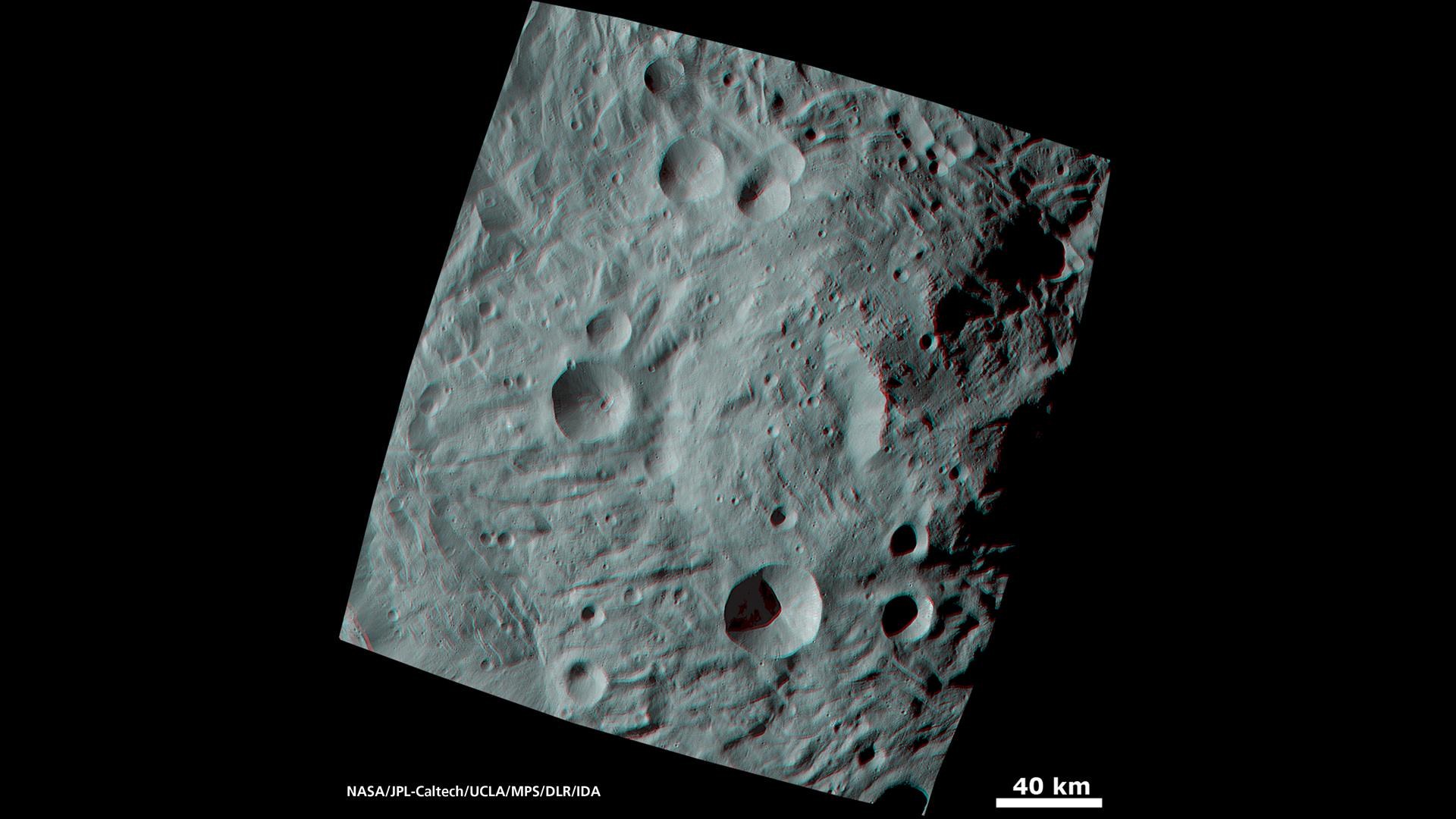 Als die NASA-Raumsonde Dawn ihre ersten Aufnahmen aus der Umlaufbahn um den Asteroiden Vesta zur Erde funkte, waren die an der Mission beteiligten Wissenschaftler fasziniert vom Anblick eines gewaltigen Bergmassivs im Zentrum einer großen, kreisförmigen Vertiefung am Südpol dieses Himmelskörpers. Mit Stereobilddaten, die aus einer Entfernung von 2.420 Kilometern zur Oberfläche mit der deutschen ‚Framing Camera’ aufgenommen wurden, war es möglich, 3D-Bilder zu erzeugen, auf denen die Struktur dieses Massivs (in der rechten Hälfte dieses Anaglyphenbildes) genau untersucht werden konnte. Die Basis des Bergs hat einen Durchmesser von etwa 200 Kilometern, und von seinem Fuß bis zum Gipfel erhebt er sich etwa 15 Kilometer über seine Umgebung. Auf den Flanken des Massivs können Hangrutschungen und gewaltige Massenbewegungen erkannt werden. Auch tektonische Strukturen, die von Spannungen in der Kruste von Vesta herrühren, haben Spuren auf der Oberfläche hinterlassen.