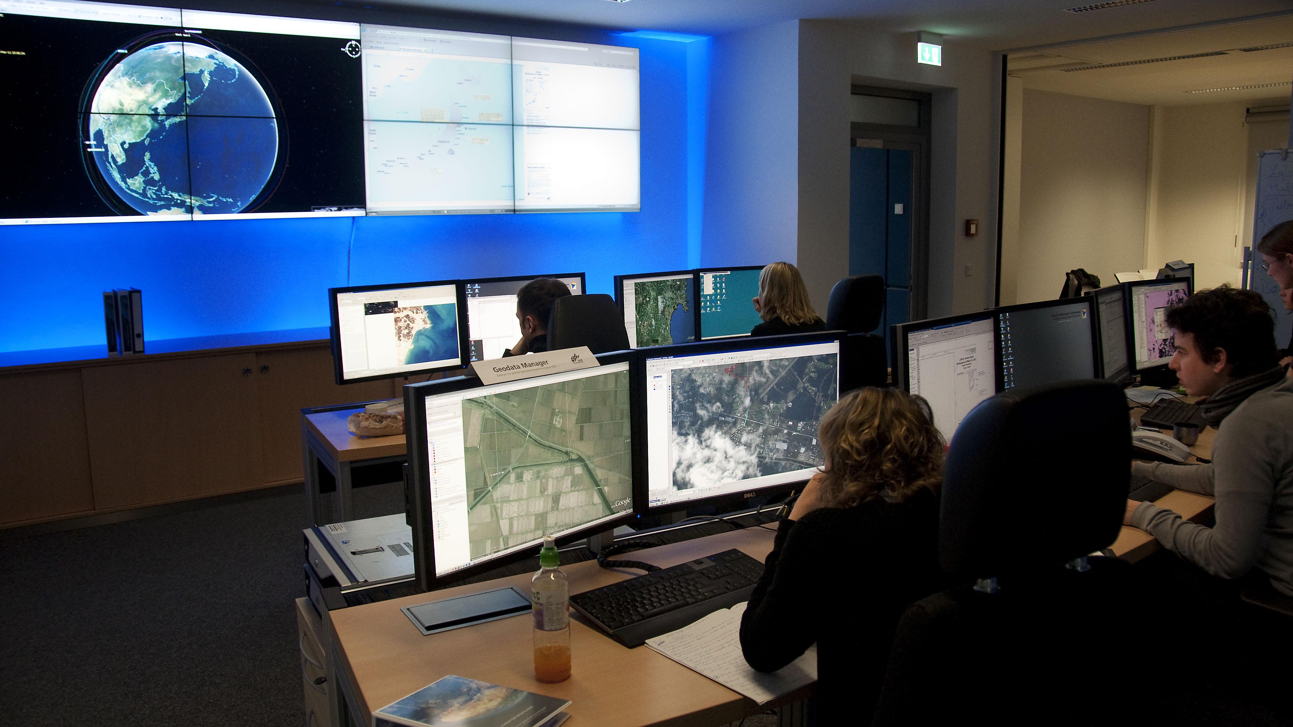 Auswertung von Satellitendaten im Zentrum für Satellitengestützte Kriseninformation (ZKI).