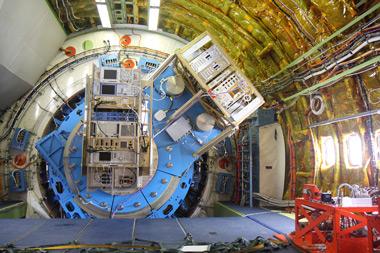 Das deutsche GREAT-Instrument (links) ist am so genannten Flansch des Teleskops (blau, im Hintergrund) angebracht.