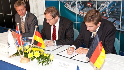 In Anwesenheit des Minsters für Bildung, Wissenschaft und Kultur, Henry Tesch, signieren Prof. Johann-Dietrich Wörner, DLR-Vorstandvorsitzender, und Per Erik Opseth, Direktor des Geodätischen Instituts der NMA, die Absichtserklärung.