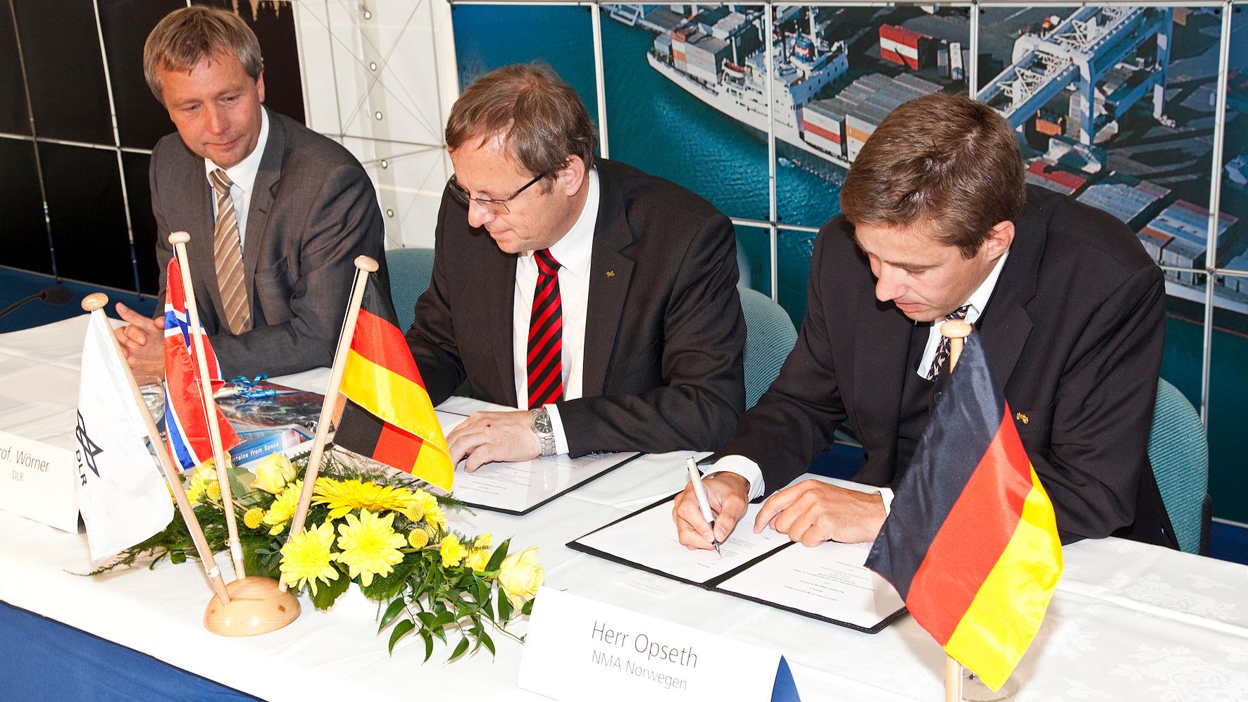 In Anwesenheit des Minsters für Bildung, Wissenschaft und Kultur, Henry Tesch, signieren Prof. Johann-Dietrich Wörner, DLR-Vorstandvorsitzender, und Per Erik Opseth, Direktor des Geodätischen Instituts der NMA, die Absichtserklärung (v.l.n.r. Henry Tesch, Prof. Johann-Dietrich Wörner, Per Erik Opseth).