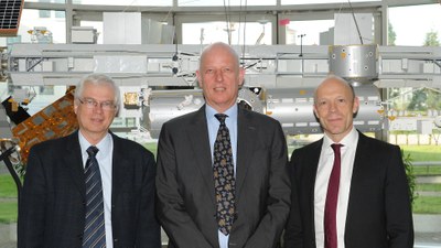 Christoph Hohage, Projektdirektor (l.), und Dr. Rolf Densing, Programmdirektor des DLR Raumfahrtmanagements (r.) heißen Dr. Gerd Gruppe als neues Vorstandsmitglied in Bonn willkommen.