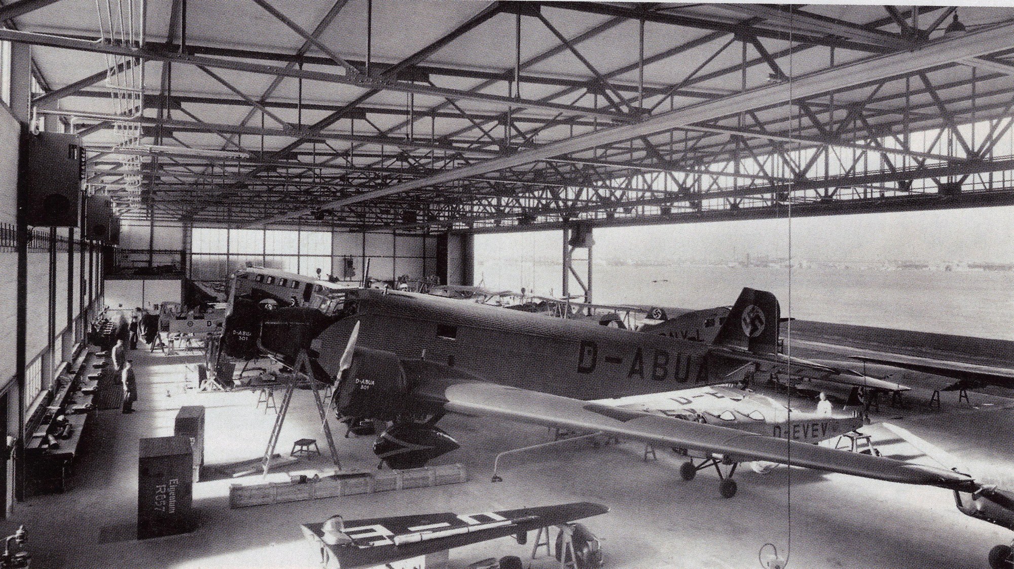 Blick in die Werfthalle der DVL in Adlershof (1936). Hier wurden die Flugzeuge für Tests vorbereitet oder danach auch untersucht.
