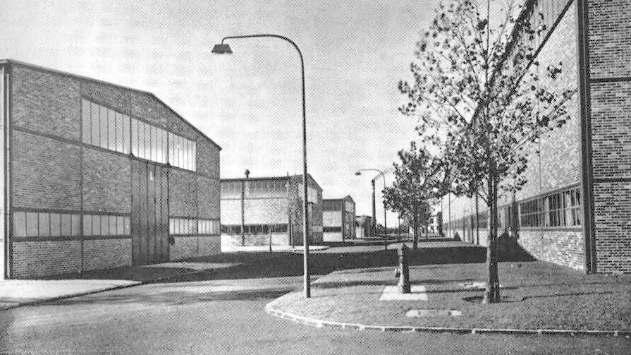 Werkstattgebäude (links) und Werfthalle (rechts) der DVL,