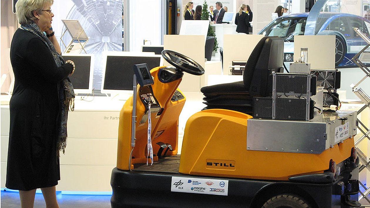 Kommerziell verfügbarer Schlepper der Still GmbH - statt mit Akkumulatoren wurde der Schlepper mit einem Brennstoffzellensystem am Heck ausgerüstet und kann so mit Wasserstoff betrieben werden.