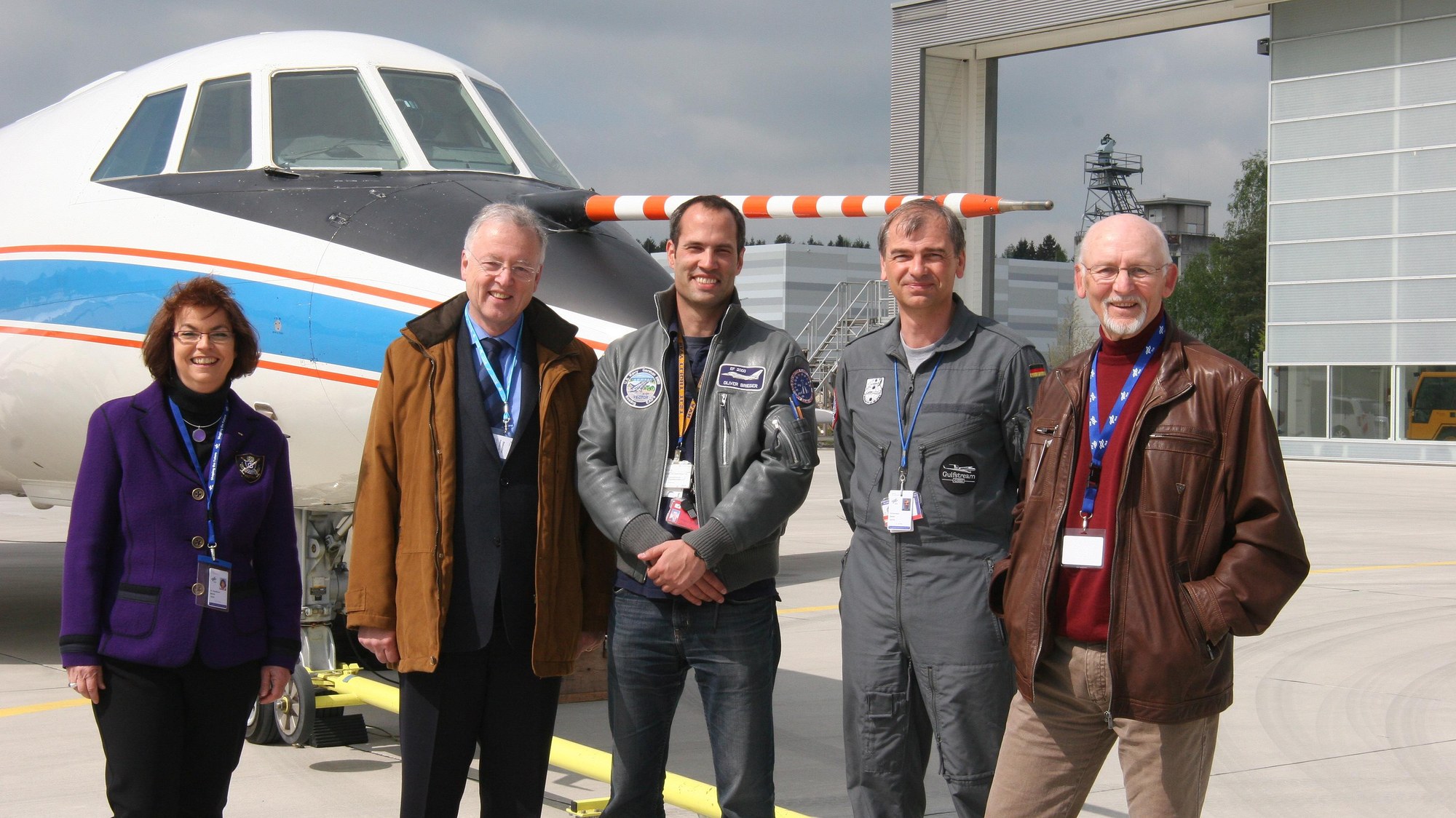 V.l.n.r.: Dr. Monika Krautstrunk, Leiterin der DLR-Flugabteilung in Oberpfaffenhofen, Prof. Dr. Ulrich Schumann, Direktor des DLR-Instituts für Physik der Atmosphäre, Oliver Brieger, Technischer Leiter der DLR-Einrichtung Flugexperimente, Stefan Grillenbeck, DLR-Testpilot, und Robert Rahn, Falcon-Pilot der ersten Stunde.