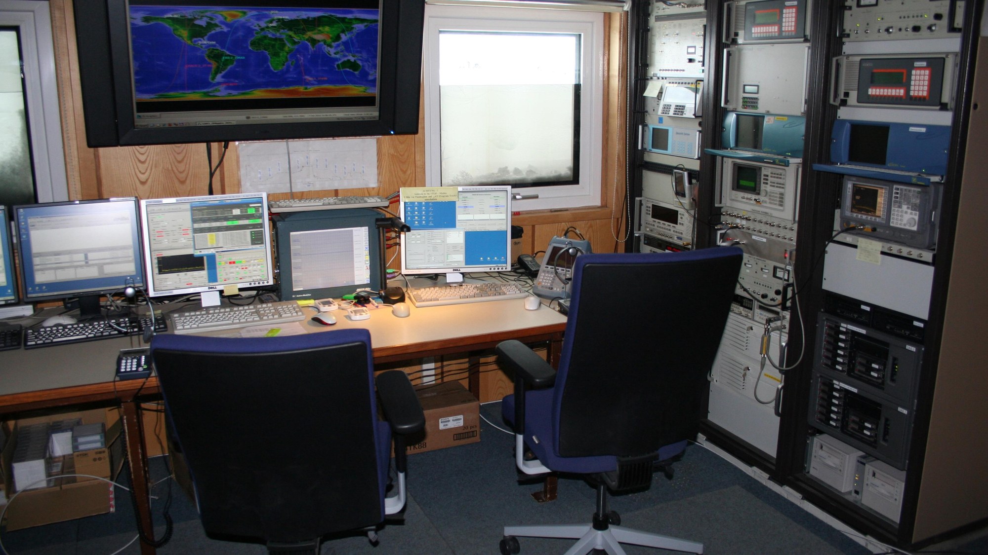 An den Monitoren kontrolliert das DLR-Team der GARS O'Higgins-Antarktisstation den Empfang von Satellitendaten. Das gesamte Jahr über wechseln sich Teams auf der Station ab.