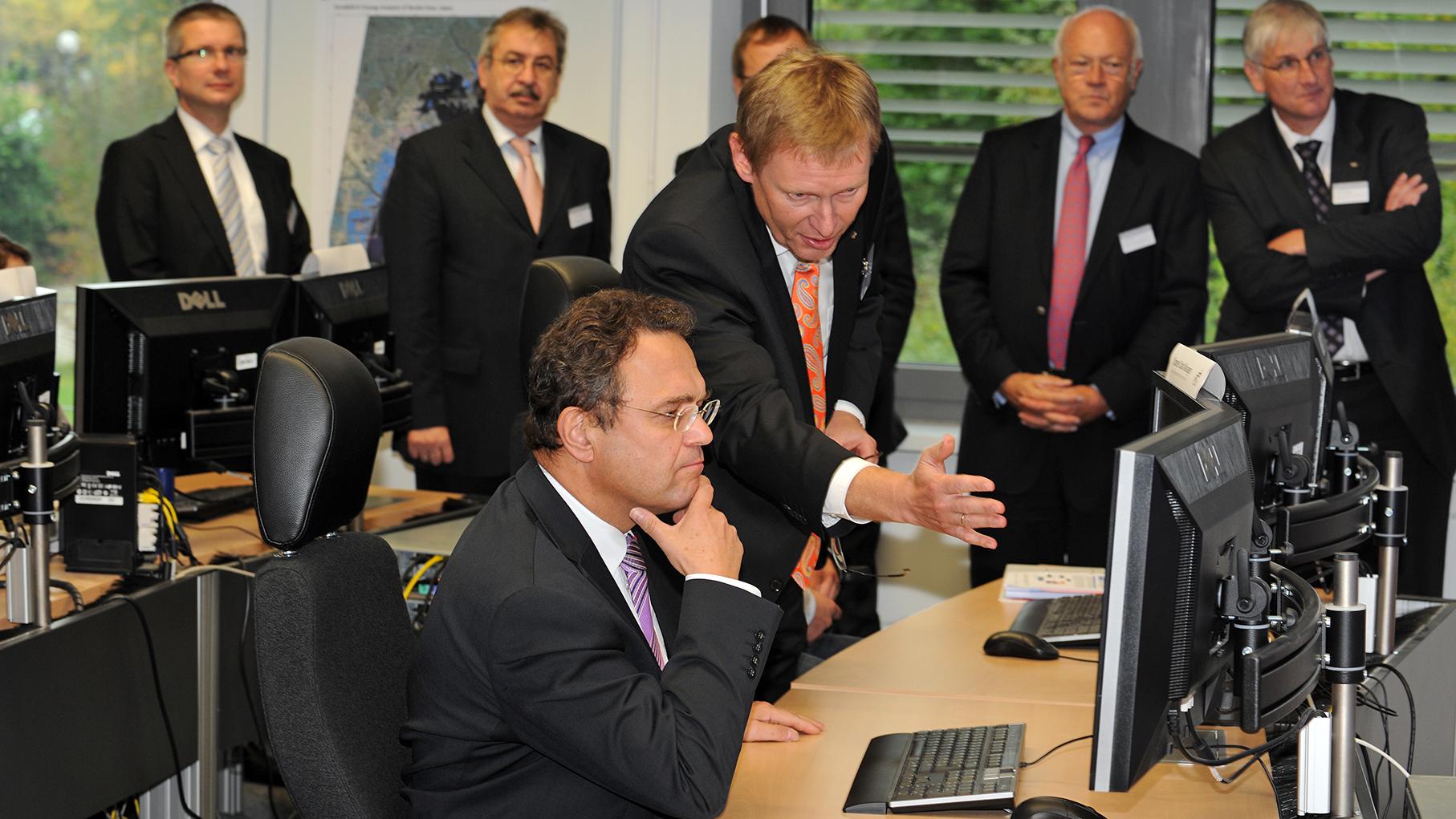 DLR-Institutsdirektor Prof.Dr. Stefan Dech (vorne stehend) präsentiert Bundesinnenminister Dr. Friedrich (vorne sitzend) die Fernerkundungsservices des DLR im Zentrum für Satellitengestütze Kriseninformation.