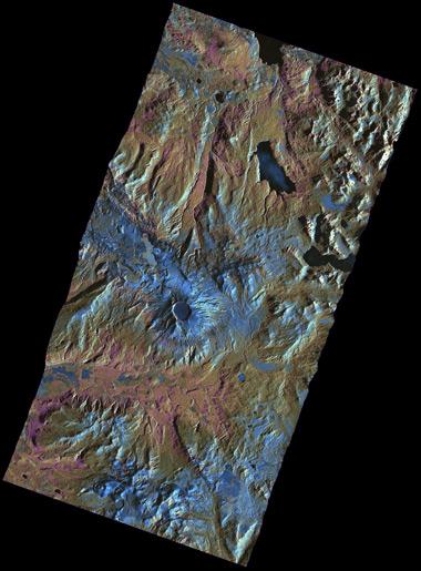 Auf dieser TerraSAR-X-Aufnahme des Vulkangebietes Puyehue-Cordón Caulle vom 6. Juli 2011 sieht man nordwestlich des markanten Puyehue-Kraters - gleichmäßig hell, fast wie ein See - das neu entstandene Lavafeld. Dieses ist durch einen Lava-Strom - etwas verwaschen bläulich im Bild - mit dem unmittelbar östlich gelegenen, neuen Eruptionskrater verbunden.