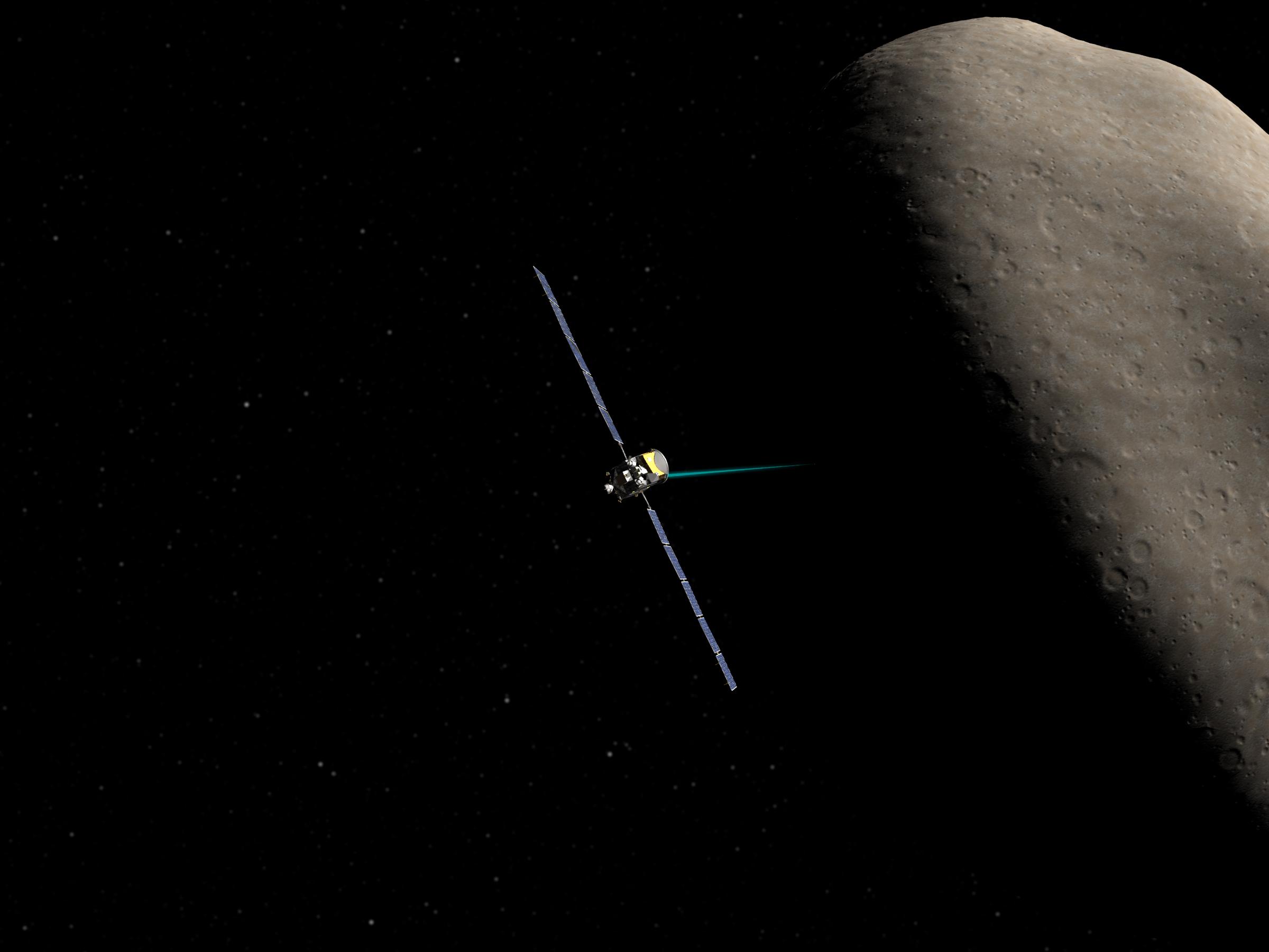 Die Dawn-Raumsonde am Asteroiden Ceres, künstlerische Darstellung.