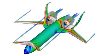 Simulation der Lokalen Strömungsgeschwindigkeit, Wirbel und Überschallbereiche des DLR-LNA bei Reiseflug.