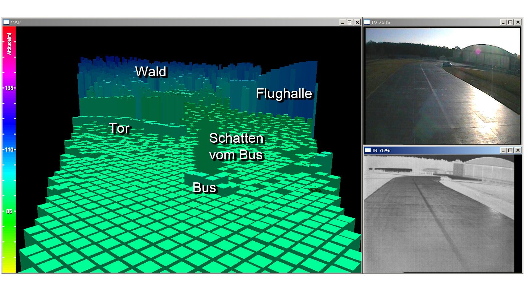 Das Deutsche Zentrum für Luft- und Raumfahrt (DLR) forscht im Projekt ALLFlight (Assisted Low Level Flight and Landing on Unprepared Landing Sites) an einem System, das eine digitale Umgebungskarte für das Cockpit erstellt und den Piloten in schwierigen Situationen unterstützt – bis hin zu einer vollautomatischen Landung. Gleich vier Sensoren kommen bei der Erstellung der dreidimensionalen digitalen Umgebungskarten zum Einsatz: TV-Kamera, Infrarotkamera, Laser sowie Radar. Nach der Fusion der Daten wird dem Pilot nur noch ein Bild von der Umgebung angezeigt, die dafür notwendigen Algorithmen werden derzeit umgesetzt. Oben rechts ist das Umgebungsbild der TV-Kamera zu erkennen, darunter das Bild der Infrarotkamera, links ist das 3-dimensionale Umgebungsbild zu erkennen.