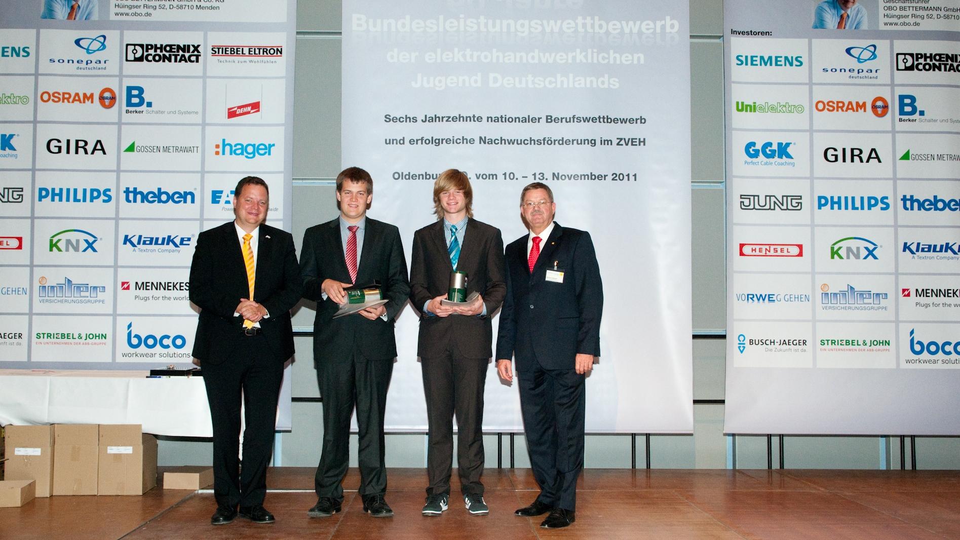Malte Rejzek (zweiter von links) aus Schleswig-Holstein und Ferdinand Vogel (zweiter von rechts) aus Baden-Württemberg freuen sich über ihre Auszeichung als erster und zweiter Bundessieger im Bereich Systemelektronik.
