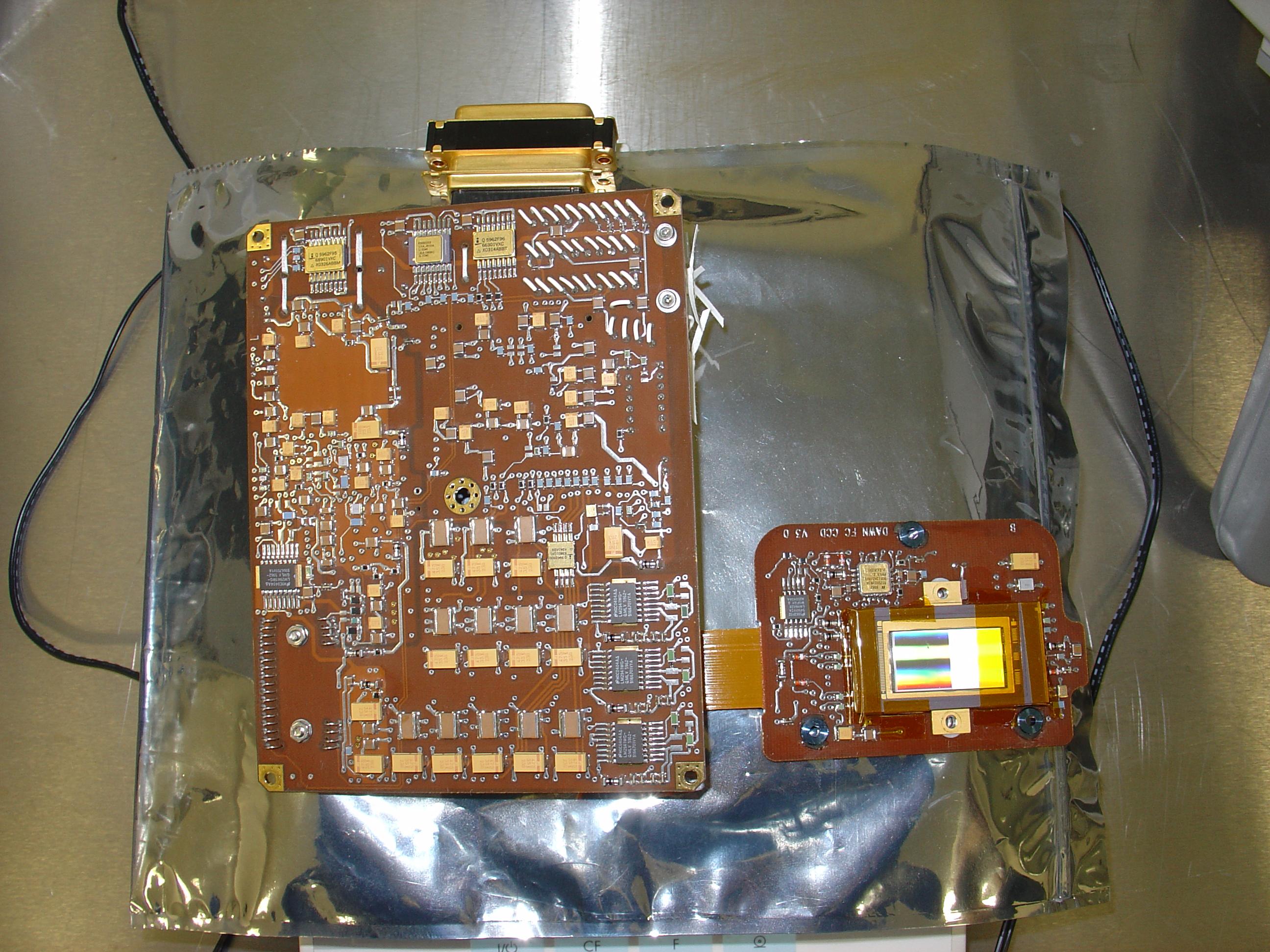 Hauptplatine der Kamera-Elektronik (links) und CCD-Platine des Detektors (rechts) der Auslese-Elektronik für die Framing Camera auf der Raumsonde Dawn.