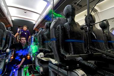 Mehr Komfort an Bord: DLR und Airbus testen erstmals neues Belüftungssystem für Flugzeuge unter realen Bedingungen. Die DLR-Forscher Gerrit Lauenroth (vorne) und Felix Werner justieren den Laser. Dieser macht die Luftströmung sichtbar.