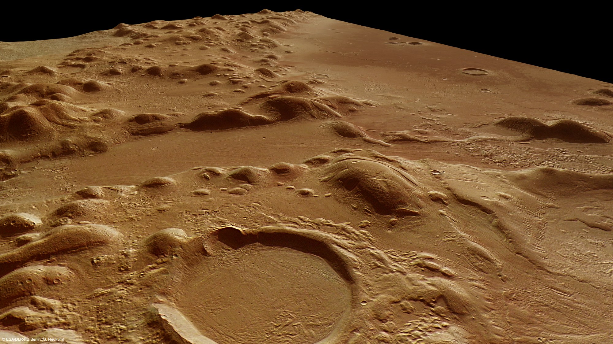 Aus den schräg auf die Oberfläche gerichteten Stereo- und Farbkanälen des Kamerasystems HRSC auf der ESA-Sonde Mars Express können realistische perspektivische Ansichten der Marsoberfläche erzeugt werden. Das Bild zeigt im Vordergrund einen Einschlagskrater, der – vermutlich über eine Lücke im Kraterrand auf der linken Seite – von Material verfüllt wurde, das plastische Eigenschaften besaß. Dies ist an den Fließstrukturen zu erkennen, die sich im Inneren des Kraters, zum Teil kreisförmig parallel zum Kraterrand, ausgebildet haben, aber auch auf der Oberfläche des den Krater umgebenden Gebiets zu sehen sind. Auch in der talförmigen Vertiefung in der Bildmitte sind Fließstrukturen zu erkennen. Sie könnten von so genannten Blockgletschern herrühren: Das sind von Gesteinsblöcken und zerriebenem Felsschutt durchsetzte Eiskörper, die auf der Erde vor allem in Permafrostgebieten der Hochgebirge oder der polaren Breiten vorkommen.