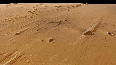 Aus den schräg auf die Oberfläche gerichteten Stereo- und Farbkanälen des Kamerasystems HRSC auf der ESA-Sonde Mars Express können realistische, perspektivische Ansichten der Marsoberfläche erzeugt werden. Das Bild zeigt einen Blick von Osten nach Westen in das Mündungsgebiet von Ares Vallis. Das durch Ares Vallis strömende Wasser floss mit hoher Energie der Chryse-Tiefebene entgegen. Hiervon zeugen die Strömungsmuster entlang der Fließrichtung des Stroms im Talgrund von Ares Vallis. Besonders auffallend in der Bildmitte ist ein Feld von zahlreichen kleinen Kratern, die hier in ungewöhnlicher Häufung auftreten. Diese könnten durch zahlreiche Einschläge eines einzelnen Projektils (Asteroid) entstanden sein, das beim Eindringen in die Atmosphäre in viele kleine Brocken auseinander gebrochen ist, die dann zu Boden fielen, oder durch den Einschlag eines Asteroiden, der viele Gesteinsbrocken des getroffenen Gebiets in die Luft geschleudert hat und die in mehreren Kilometern Entfernung wieder zu Boden fielen (sekundäre Krater).