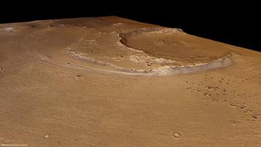 Aus den schräg auf die Oberfläche gerichteten Stereo- und Farbkanälen des Kamerasystems HRSC auf der ESA-Sonde Mars Express können realistische, perspektivische Ansichten der Marsoberfläche erzeugt werden. Das Bild zeigt einen Blick von Südwesten nach Nordosten auf den 32 Kilometer großen Krater Oraibi im Mündungsgebiet von Ares Vallis. Wasser, das durch dieses Ausflusstal geströmt ist, hat einen Teil des Kraterrandes von Oraibi erodiert. Auffallend sind terrassenartige Geländestufen, die am Westufer von dem einst mit großer Energie strömenden Wasser aus dem anstehenden Hochlandsockel 'gefräst' wurden. Im rechten Bilddrittel ist ein Feld von zahlreichen kleinen Kratern zu sehen. Diese könnten durch zahlreiche Einschläge eines einzelnen Projektils (Asteroid) entstanden sein, das beim Eindringen in die Atmosphäre in viele kleine Brocken auseinander gebrochen ist, die dann zu Boden fielen, oder durch den Einschlag eines Asteroiden, der viele Gesteinsbrocken des getroffenen Gebiets in die Luft geschleudert hat und die in mehreren Kilometern Entfernung wieder zu Boden fielen (sekundäre Krater).