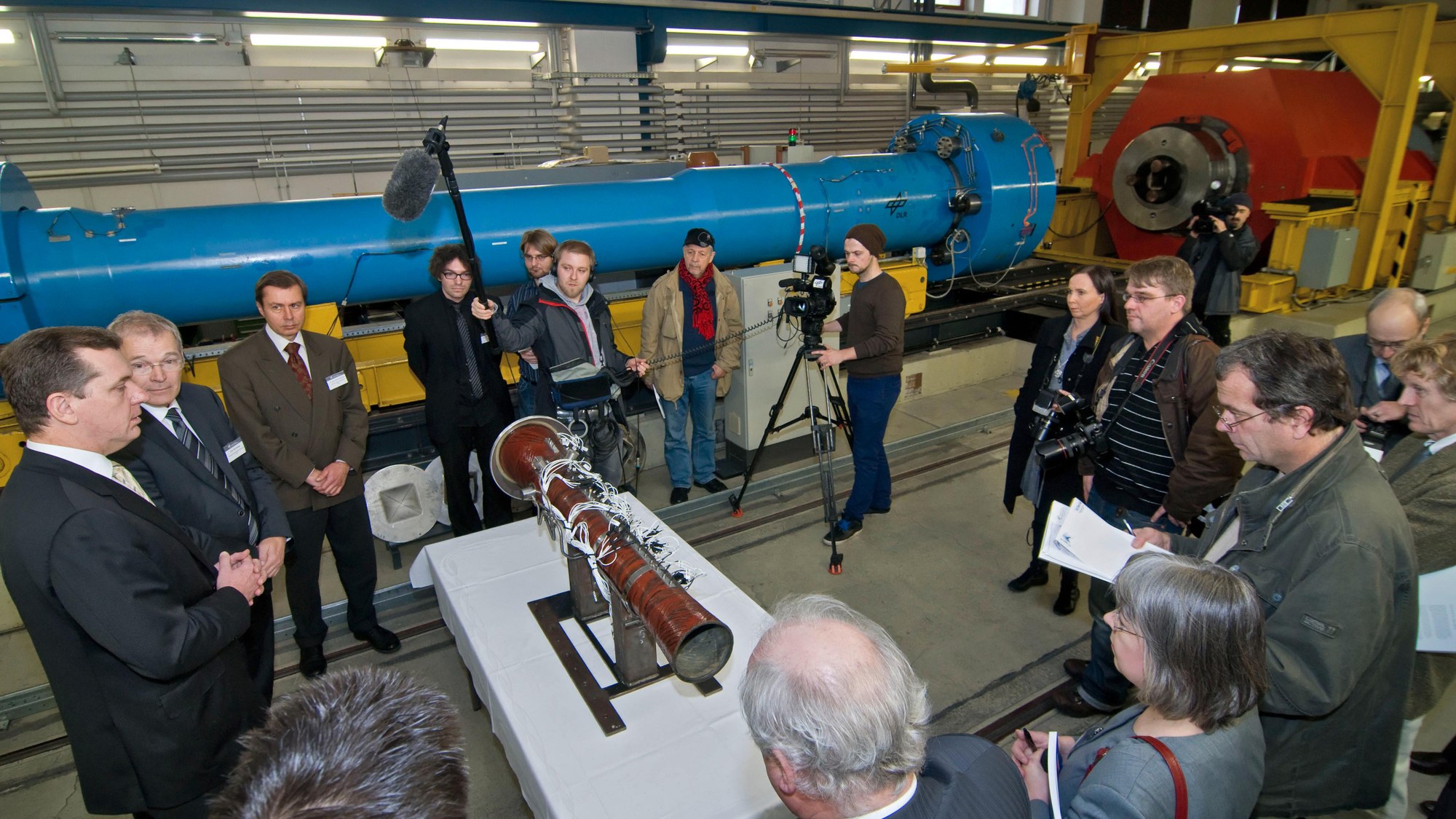 Der Botschafter Peter Tesch und DLR-Luftfahrtvorstand Prof. Rolf Henke geben am Hochenthalpiekanal Göttingen Statements ab.