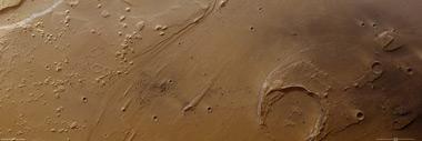 Mit dem senkrecht auf die Marsoberfläche gerichteten Nadirkanal und den Farbkanälen des Kamerasystems HRSC (High Resolution Stereo Camera) auf der ESA-Raumsonde Mars Express wurde diese Farb-Draufsicht erzeugt. Norden ist im Bild rechts, das abgebildete Gebiet ist etwa 220 mal 70 Kilometer groß und hat damit etwa die Ausdehnung von Schleswig-Holstein. Auch wenn der für den Mars typische irdene Farbton die Szene dominiert, lässt die Verarbeitung von Farbdaten Material- und Texturunterschiede der Marsoberfläche akzentuiert hervortreten, so beispielsweise links der Bildmitte, wo an einer 'Insel', die der Erosion durch Wasser widerstehen konnte, dunkle Stellen auf die Verfrachtung von einem dunkleren Material möglicherweise durch Wind hindeutet.