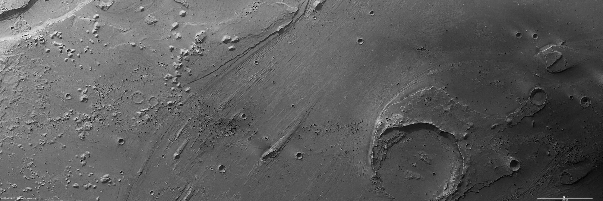 Ares Vallis windet sich über 1.700 Kilometer durch das südliche Hochland des Planeten und endet in einer über 100 Kilometer breiten Mündung im Tiefland der Chryse-Ebene. In der Frühzeit des Mars strömten große Mengen Wasser durch das Tal, die auch den Rand des 32 Kilometer großen Kraters Oraibi (Bildmitte) erodiert haben. Ferner sind stromlinienförmige 'Inseln' und terrassenartige 'Uferbänke' an den Talrändern zu sehen: Spuren von Erosion, die das Wasser, das in Ares Vallis geflossen ist, in der Landschaft hinterlassen hat.