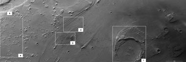 Durch das Ausflusstal Ares Vallis strömten in der Frühzeit des Mars große Mengen an Wasser, das Erosionsspuren hinterlassen hat. Die Stereokamera HRSC auf der ESA-Raumsonde Mars Express hat diese Spuren in Aufnahmen vom 11. Mai 2011 festgehalten. Die Bildauflösung beträgt etwa 15 Meter pro Bildpunkt; Norden ist in dieser Draufsicht rechts. Der Krater Oraibi (Bildausschnitt 1) wurde vom Wasser umspült und der südliche Rand des Kraters von den Wassermassen durchbrochen. An den Rändern des Tals sind 'Uferbänke' zu sehen, die vom Wasser erzeugt wurden (Bildausschnitt 2). Am Talboden sind stromlinienförmige 'Inseln' erkennbar (Bildausschnitt 3), die die Fließrichtung anzeigen. Auf dem Hochplateau sind viele einzelne Rest- oder Inselberge zu sehen (Bildausschnitt 4): Sie erscheinen als Überbleibsel einer früheren durchgehenden Bedeckung, die größtenteils erodiert wurde. Am linken oberen Bildrand (Bildausschnitt 5) ist ein etwa vier Kilometer breiter Hangrutsch zu erkennen, der durch den Einschlag des Asteroiden ausgelöst worden sein könnte, dessen Kraterauswurfmasse im Bildausschnitt 4 zu sehen ist.