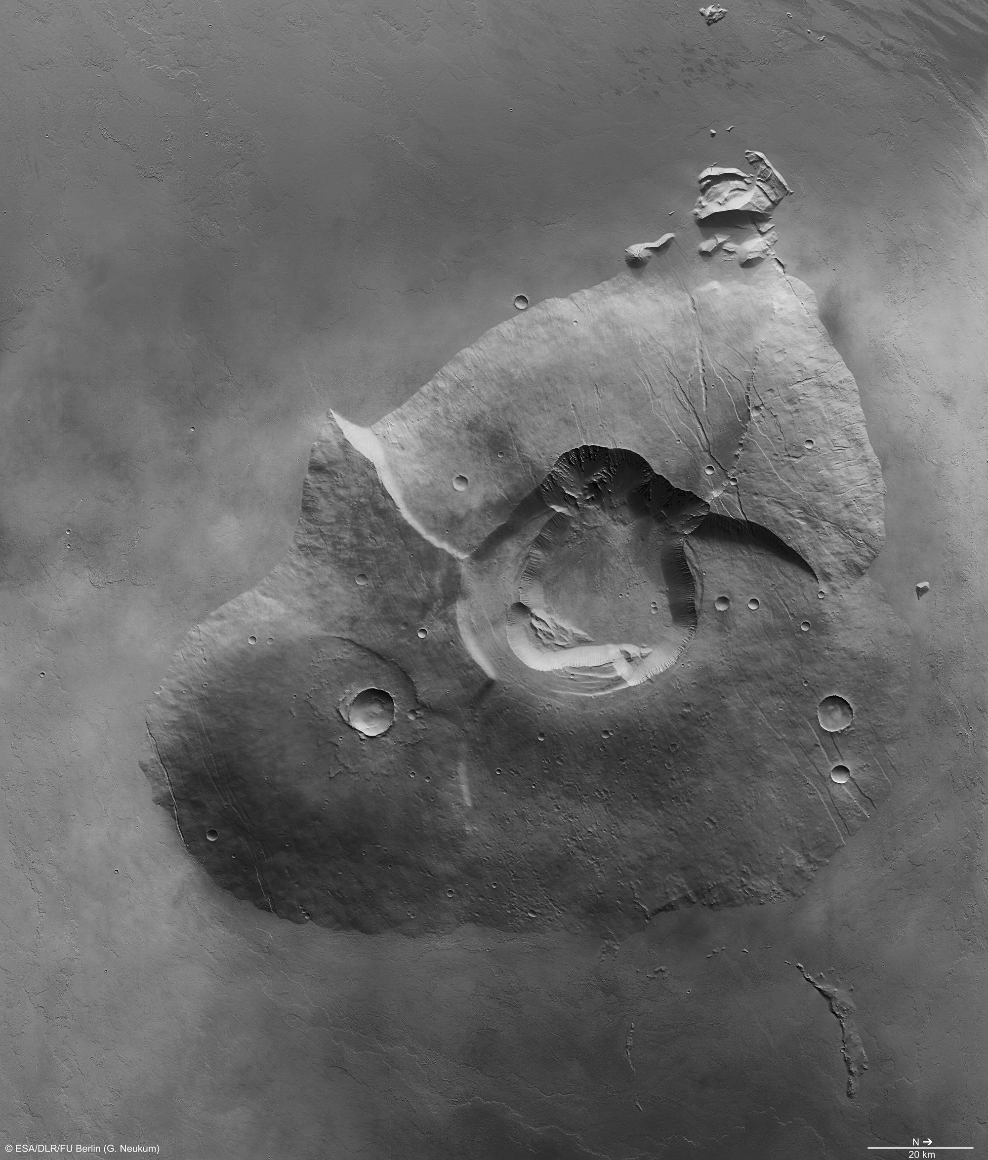Die wahre Ausdehnung von Tharsis Tholus ist in diese Nadiraufnahme (der senkrechten Draufsicht auf den Vulkankomplex in Schwarzweiß) zu erkennen. Aus seiner Umgebung erhebt sich Tharsis Tholus auf einer Grundfläche von etwa 125 mal 135 Kilometern Durchmesser. Der Vulkan wurde von zahlreichen Lavaströmen umflossen. Dies hatte zur Folge, dass der ursprüngliche Fuß des Vulkans nicht mehr erkennbar ist. Gemessen an der Vielzahl und Mächtigkeit der Lavaströme ist es möglich, dass Tharsis Tholus bis zu mehreren Kilometern Tiefe in Lava "ertrunken" ist. Der senkrecht auf die Marsoberfläche gerichtete Nadirkanal der Stereokamera HRSC auf Mars Express erzeugt die höchste Bildauflösung, die bei diesen Aufnahmen etwa 14 Meter pro Bildpunkt (Pixel) beträgt.