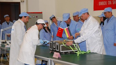 Wieder zurück auf der Erde: Die SIMBOX-Apparatur wurde vom Landeort zur chinesischen Organisation für Raumwissenschaft (GESSA) transportiert. Gespannt öffnen die deutschen und chinesischen Projektverantwortlichen die Hülle der Apparatur.