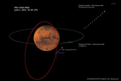 Konstellation und Orbitalparameter von Phobos und Mars Express. Zu beachten sind die Flugrichtungen von beiden Körpern. Der Buchstabe "S" weist auf den Südpol hin. Die Graphiken wurden mit der Software Celestia erstellt.