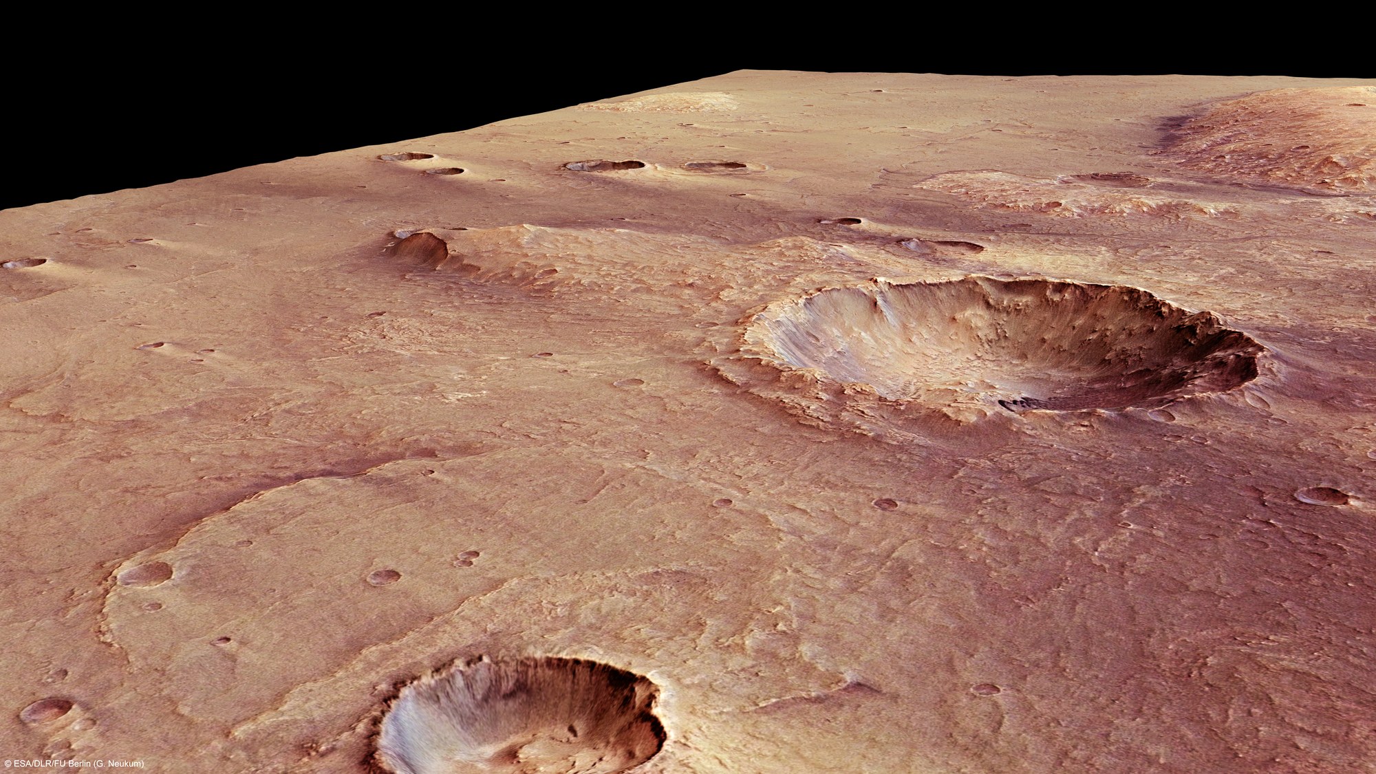 Aus den schräg auf die Oberfläche gerichteten Stereo- und Farbkanälen des Kamerasystems HRSC auf der ESA-Sonde Mars Express können realistische, perspektivische Ansichten der Marsoberfläche erzeugt werden. Zwischen den beiden markanten Einschlagskratern im Vordergrund und rechts der Bildmitte sieht man den kreisrunden Umriss eines älteren Kraters, der nahezu vollständig von dünnflüssiger Lava angefüllt wurde.