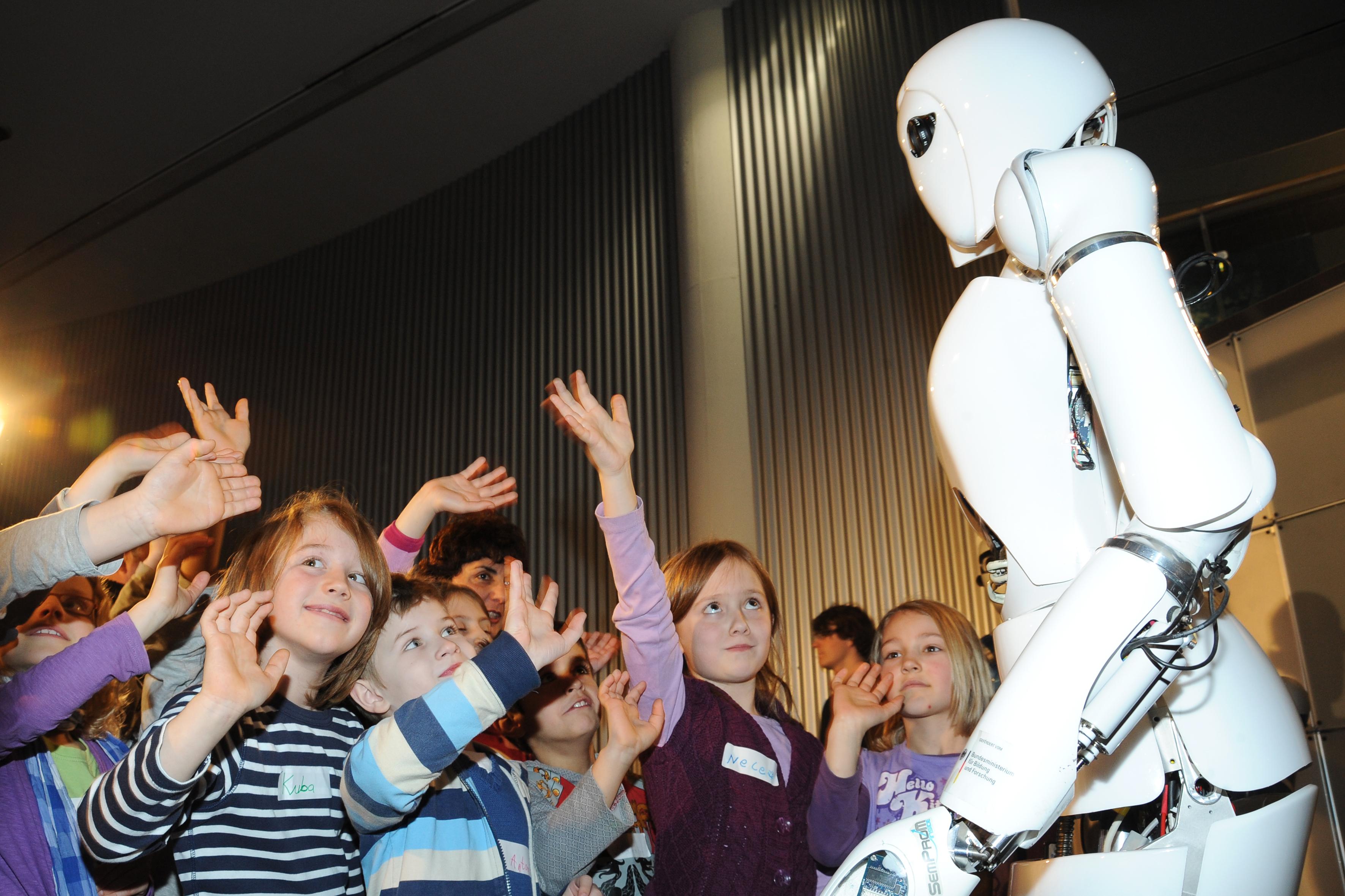 Großer Andrang bei der Eröffnung der Robotik-Ausstellung im Deutschen Museum Bonn: Schulkinder begrüßen die humanoide Roboterdame AILA vom Deutschen Forschungszentrum für Künstliche Intelligenz (DFKI) aus Bremen.