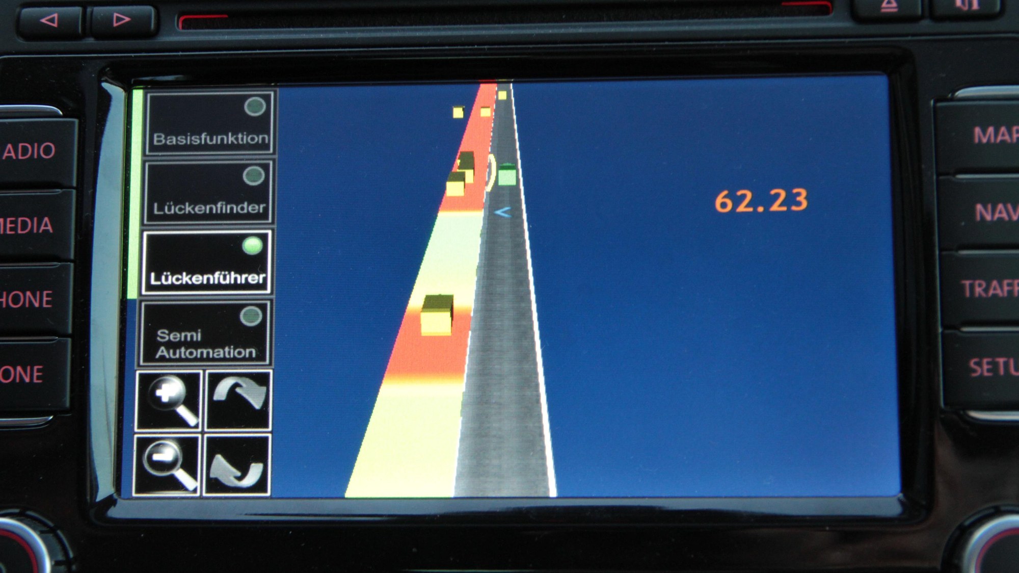 Der Ein- und Ausfädelassistent gibt dem Fahrer Hinweise auf die ideale Geschwindigkeit zum Erreichen der besten Lücke, die durch den blauen Pfeil gekennzeichnet ist.