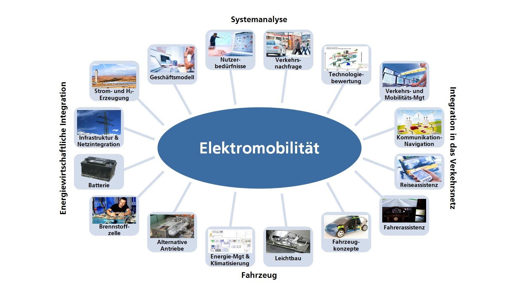 Die systemische Elektromobilitätsforschung im DLR umfasst die vier Forschungsfelder Systemanalyse, energiewirtschaftliche Integration, Fahrzeug und die Integration in das Verkehrsnetz.