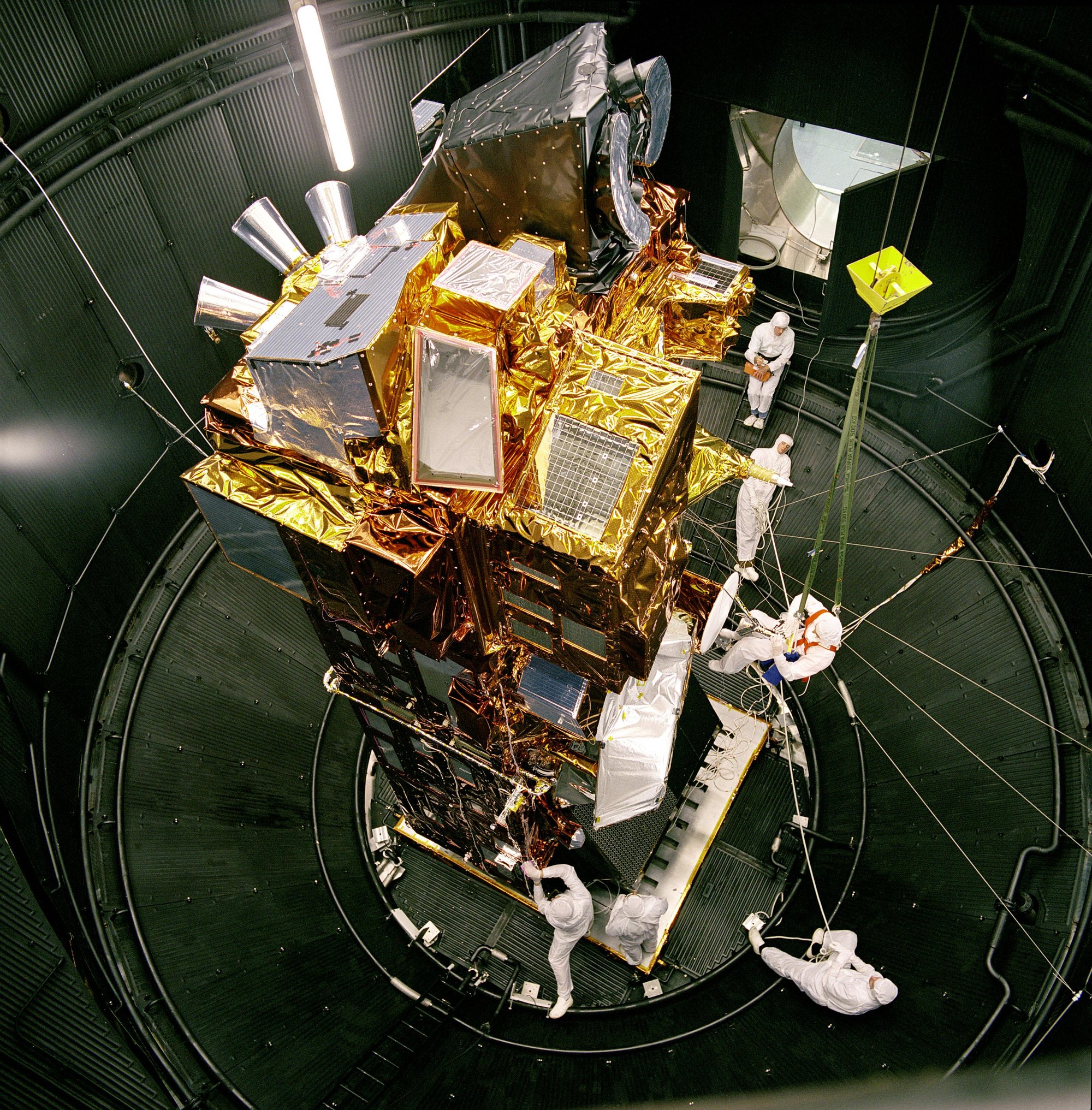 ENVISAT wurde im Large Space Simulator im ESA-Standort ESTEC ausführlich geprüft. In diesem Bild wurde ENVISAT gerade auf einen Temperaturtest vorbereitet.