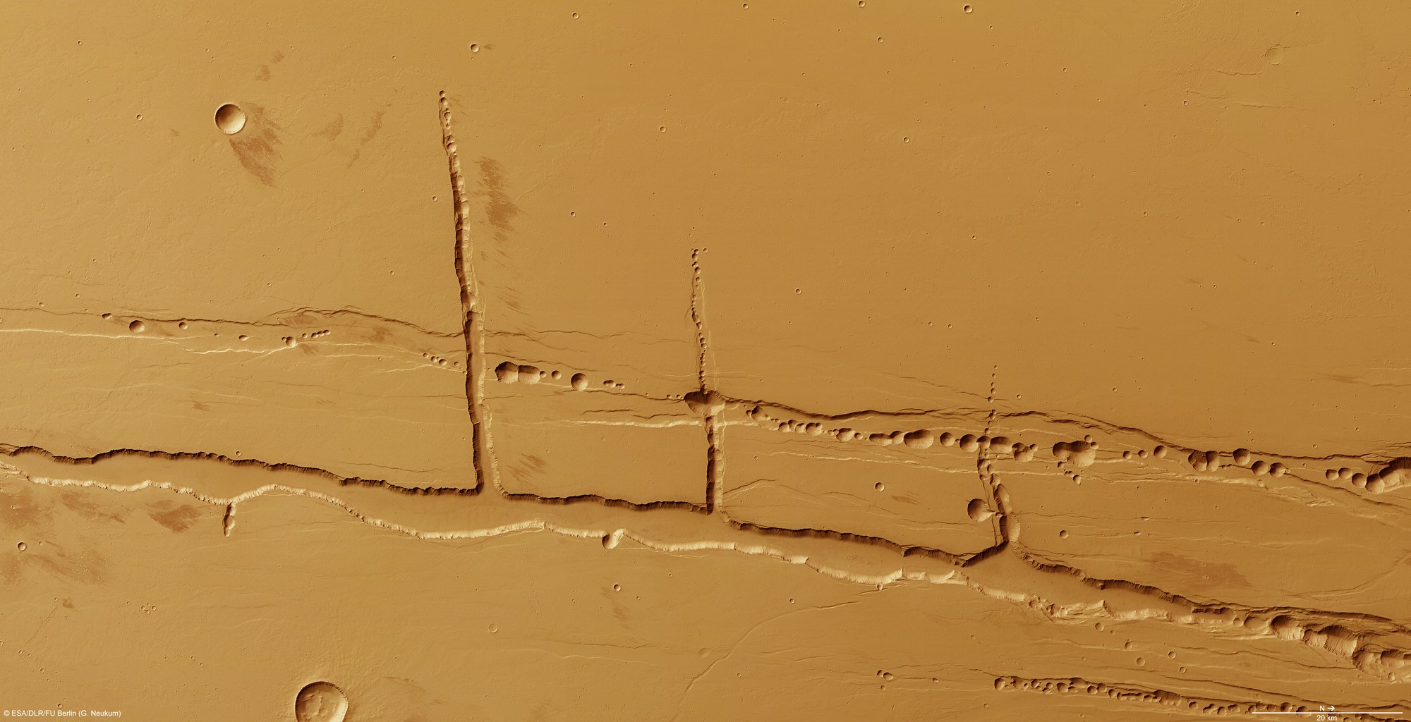 Mit dem senkrecht auf die Marsoberfläche gerichteten Nadirkanal und den Farbkanälen der hochauflösenden Stereokamera HRSC auf der ESA-Raumsonde Mars Express wurde diese Farb-Draufsicht erzeugt; Norden ist im Bild rechts. Der gezeigte Bildausschnitt umfasst eine Fläche von fast 20.000 Quadratkilometern, was etwa der doppelten Größe der Insel Kreta entspricht. Neben dem für den Mars typischen monotonen Ocker sind einzelne kleine, dunkle Felder zu erkennen, bevorzugt in der Nähe von Geländehindernissen wie den markanten Bruchstrukturen oder an den Rändern von Einschlagskratern. Dabei handelt es sich um Dünenfelder aus dunklen Stäuben und Sanden, die vermutlich vulkanischen Ursprungs sind und vom Wind aus größerer Entfernung hierhin verfrachtet wurden.