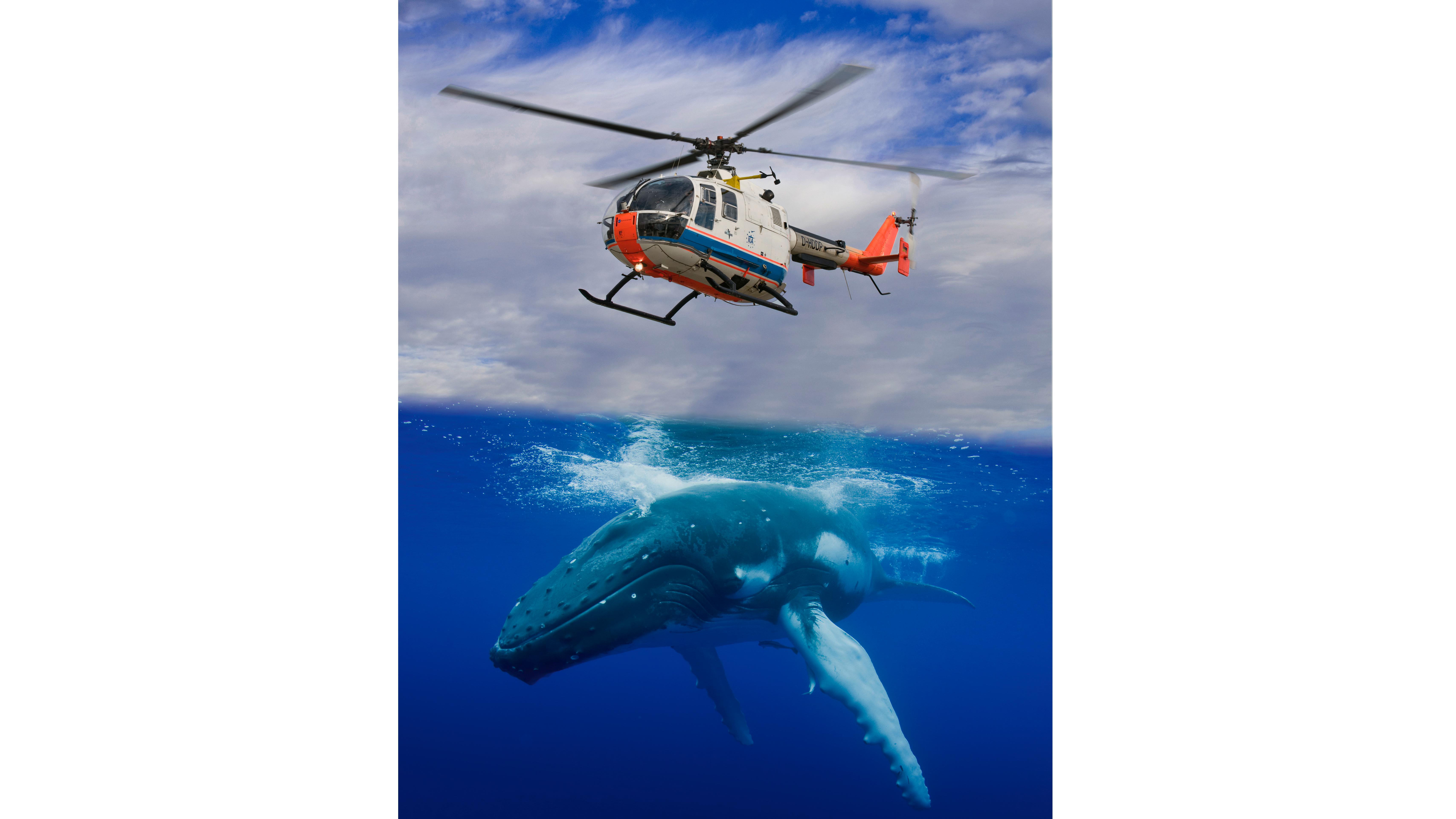 Vom Buckelwal lernen heißt besser fliegen lernen: Bei der Suche nach einer Möglichkeit, den Strömungsabriss bei Hubschraubern zu vermeiden, sind Forscher des DLR Göttingen beim Buckelwal fündig geworden. Die Meeressäuger sind für ihre große Schnelligkeit und Akrobatik bekannt. Dies verdanken sie ihren ungewöhnlich großen Brustflossen, die an der Vorderseite charakteristische Beulen aufweisen. Die DLR-Forscher haben die Idee von Beulen zur Verringerung des Strömungsabrisses auf den Hubschrauberrotor übertragen und mit der Bo 105 im November 2011 getestet.