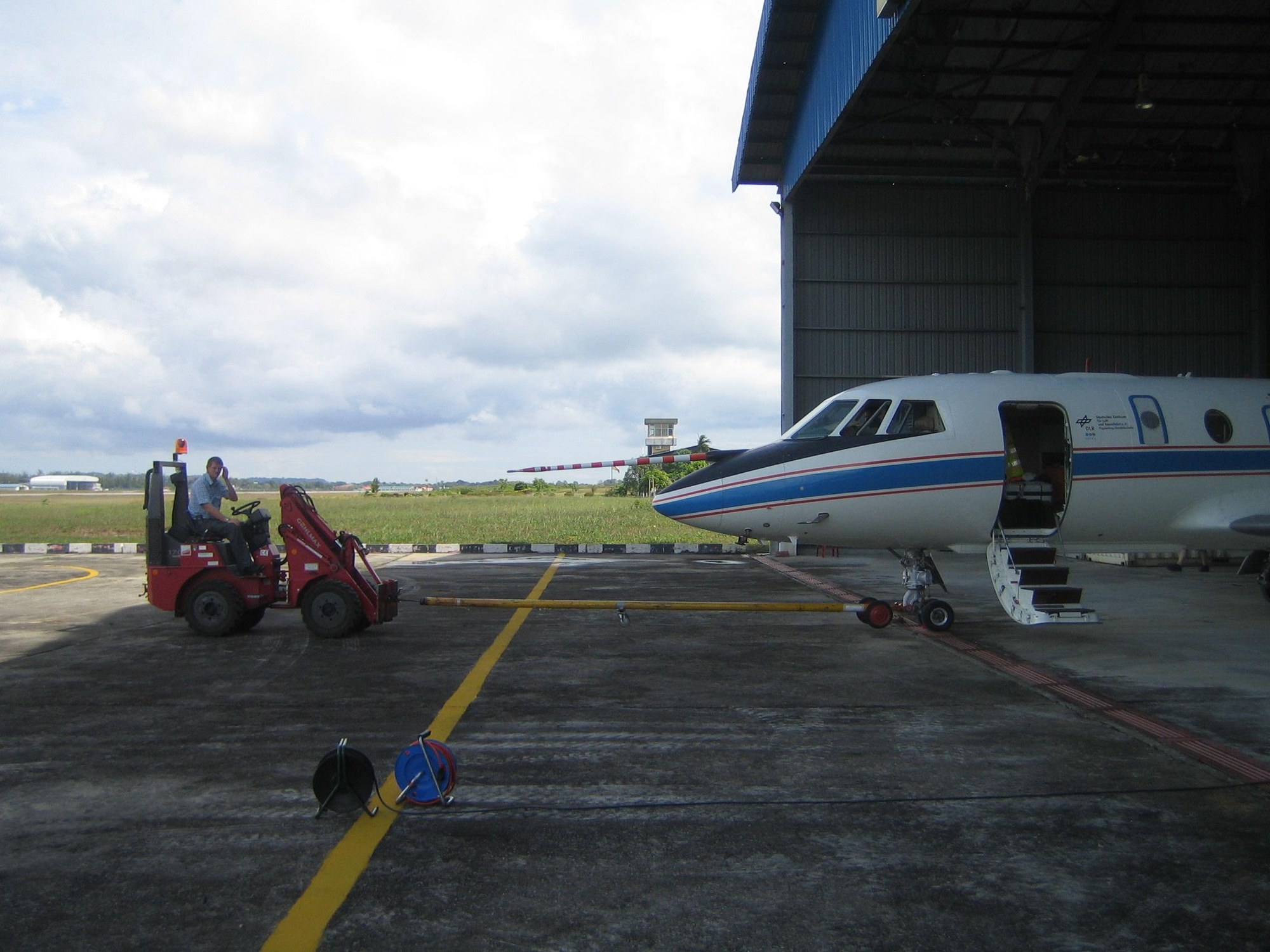 Die Falcon wird aus dem Hangar in Miri, Borneo, geschleppt.