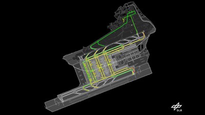 Die farbigen Rollbahnen geben einen groben Eindruck über die Menge des verwendeten Brennstoffs und der produzierten Emissionen der Flugzeuge beim Rollen. Die Skala reicht von keiner Farbe (kein Kraftstoffverbrauch und Emissionen) über grün und gelb (geringer Kraftstoffverbrauch und niedrige Emissionen) zu rot für höhere Beträge.