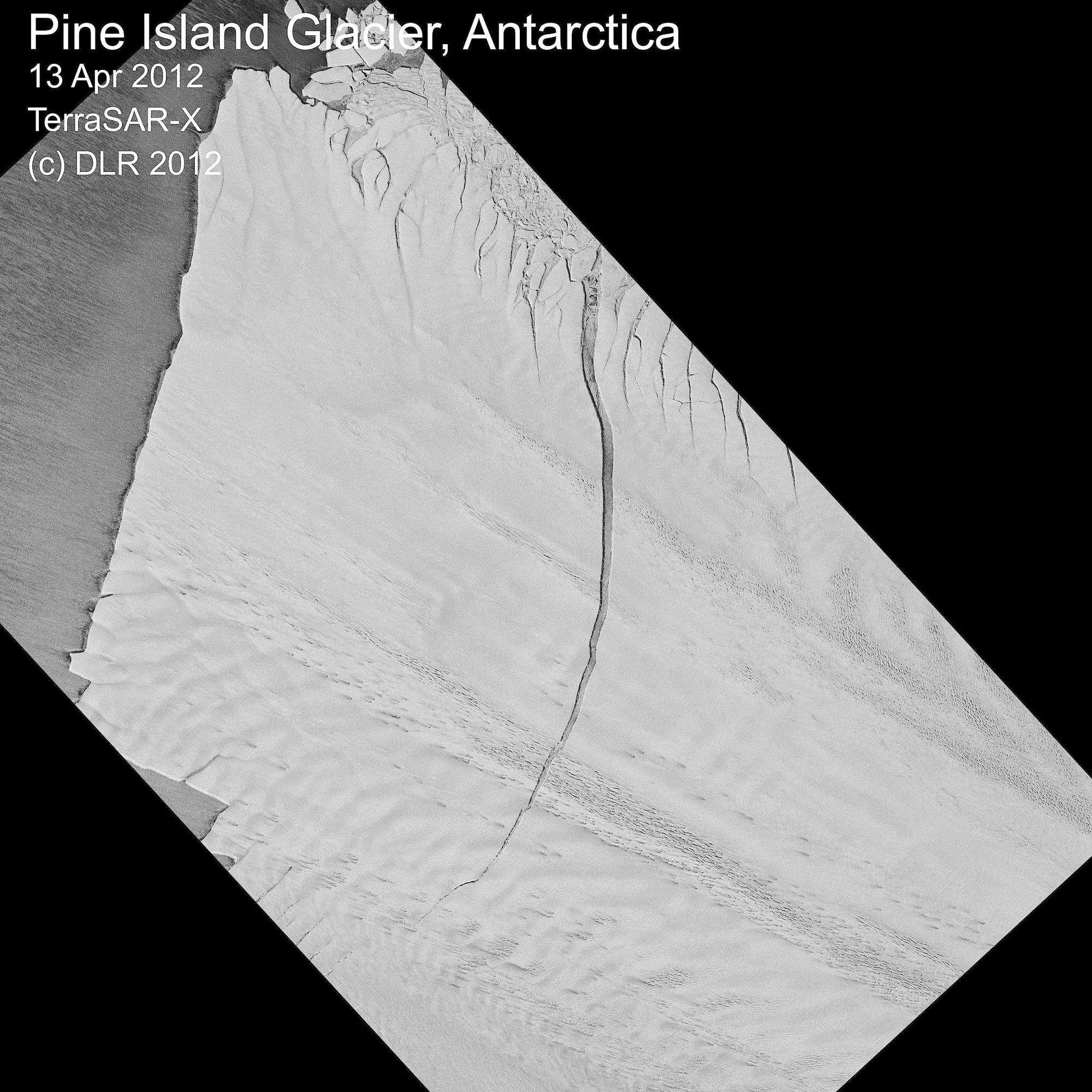 13. April 2012: Der Riss am Pine-Island-Gletscher ist weiter fortgeschritten und hat sich geweitet. Die Rissflanken sind nun bis zu 540 Meter voneinander entfernt, der Riss ist 28 Kilometer lang. Am oberen Ende sieht man umgekippte Eisberge in der Rissöffnung liegen.