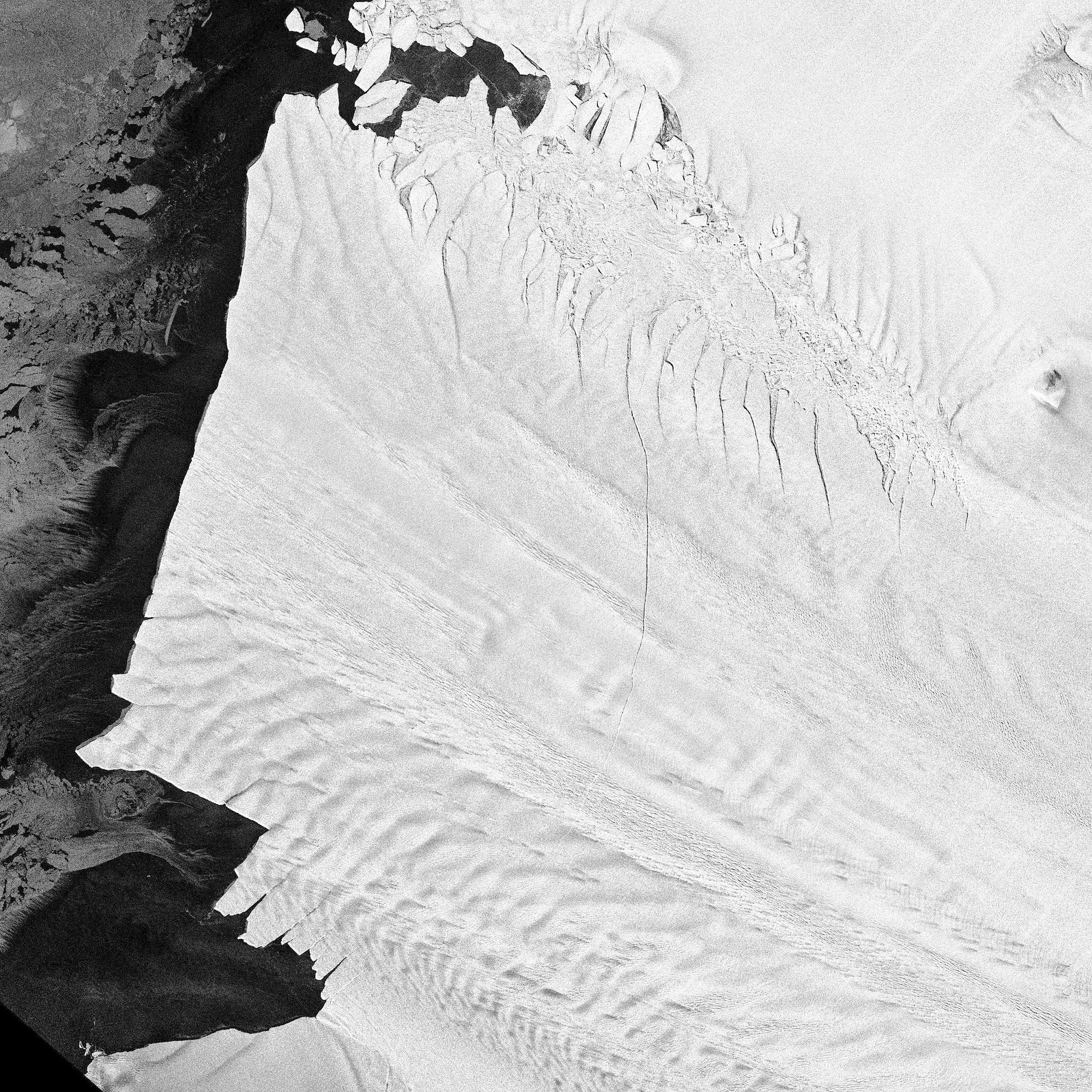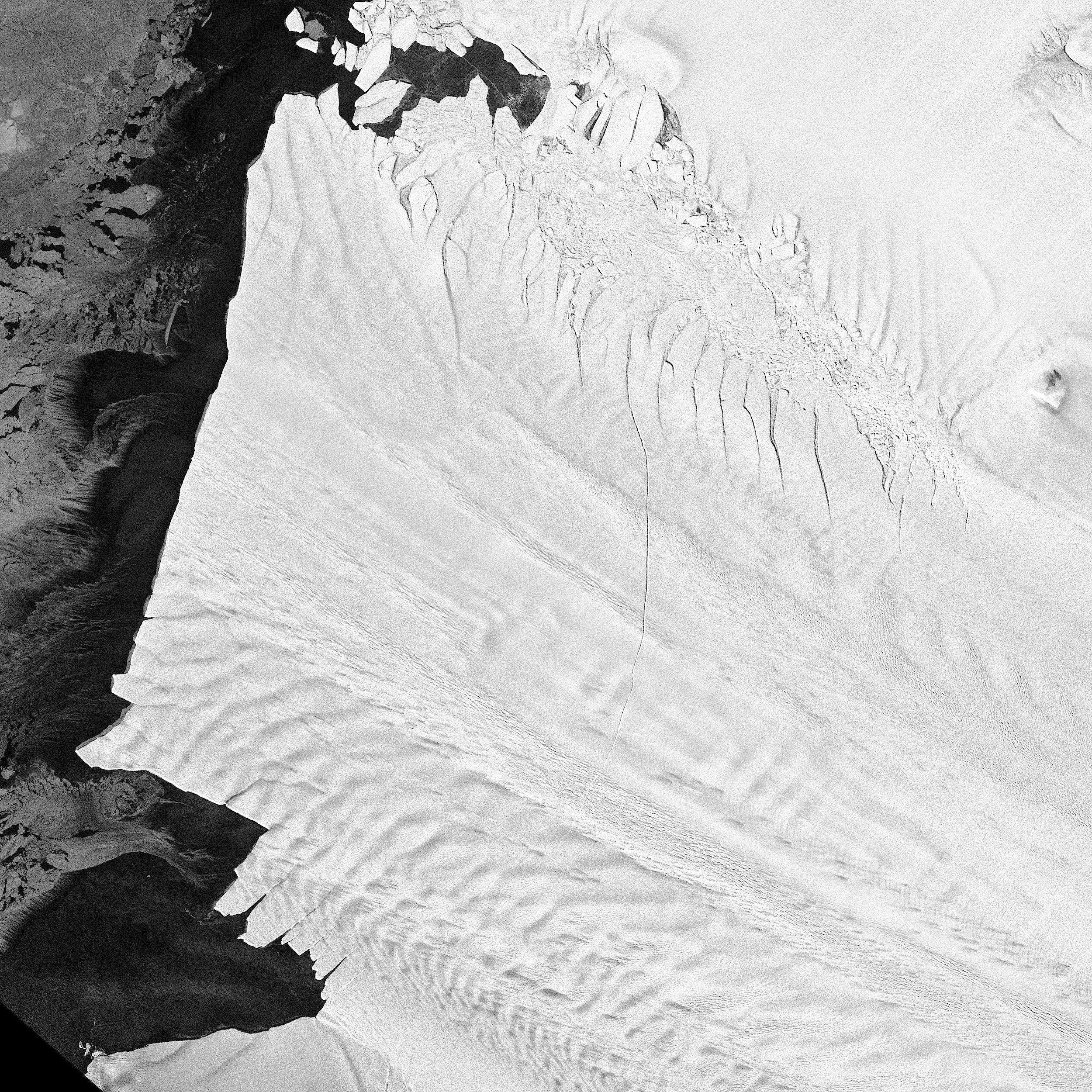 Die erste TerraSAR-X-Szene, die den noch schmalen Riss in der Bildmitte mit Ausbreitungsrichtung von oben nach unten zeigt, stammt vom 13. Oktober 2011. Zu diesem Zeitpunkt war der Riss 24 Kilometer lang und an der weitesten Stelle (im Bild oben) 50 Meter breit.