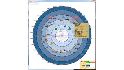 Das so genannte pax_radar stellt den aktuellen landseitigen Status der Flüge am Flughafen dar. Jeder der Kreise repräsentiert einen Flug. Die Größe der Kreisfläche gibt die Anzahl der gebuchten Passagiere wieder. Die Position der Kreisflächen ergibt sich aus der Gateposition oder der Airline, des Flugzeugtypes beziehungsweise des Zielflughafens und der Zeit bis zur Off-Block-Zeit des Flugs.