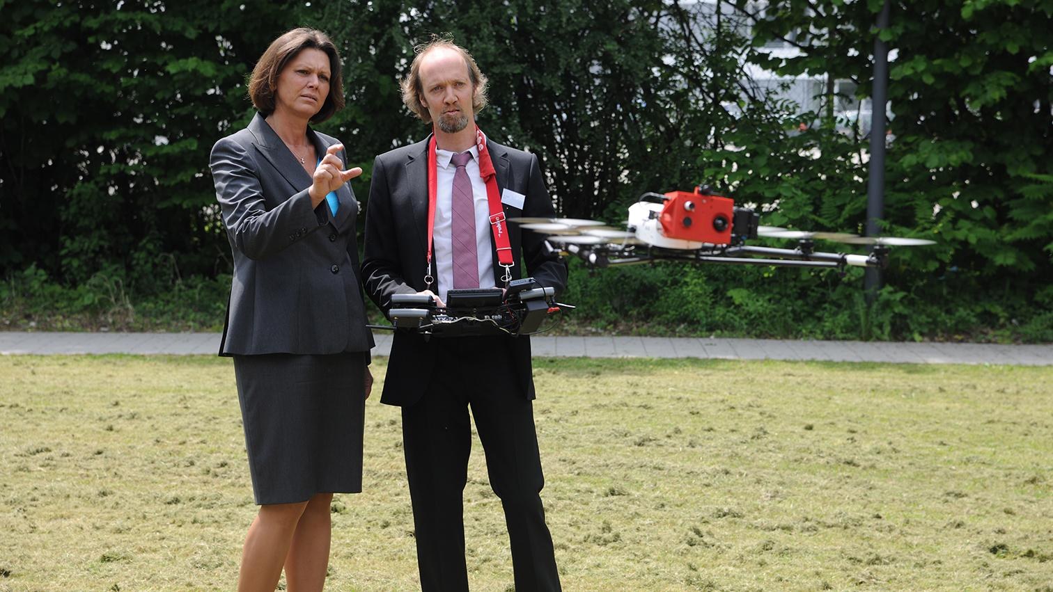 Bundeslandwirtschaftsministerin Ilse Aigner lässt sich von DLR-Entwickler Martin Israel genau erklären, wie das fliegende Wildrettersystem in den nächsten Jahren aufgebaut werden soll.