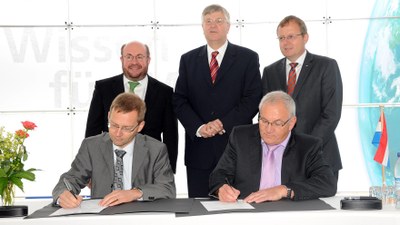 Unterzeichnung der gemeinsamen Absichtserklärung in Weilheim durch Prof. Dr. Felix Huber (links), Direktor des DLR-Raumflugbetriebs und Gerhard Bethscheider (rechts), Geschäftsführer der SES ASTRA TechCom. Begleitet von (stehend, von links nach rechts) François Biltgen, Minister für Justiz, Kommunikation und Medien in Luxemburg, Peter Hintze, Parlamentarischer Staatssekretär beim Bundesminister für Wirtschaft und Technologie und Prof. Dr. Johann-Dietrich Wörner, Vorstandsvorsitzende des DLR.