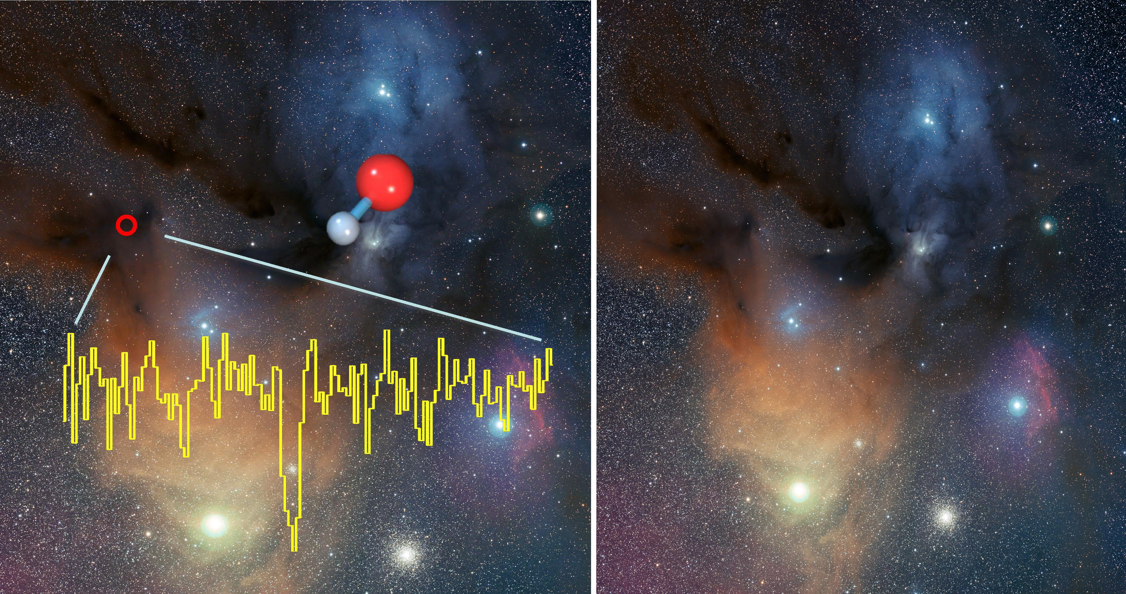 Die Aufnahme zeigt das farbenprächtige Sternentstehungsgebiet um den Stern Rho Ophiuchi in circa 400 Lichtjahren Entfernung. Die Position des massearmen Protosterns IRAS16293-2422 ist mit einem roten Kreis markiert; in dieser Richtung konnte das Molekül OD, also deuteriertes Hydroxyl, erstmalig im Weltraum nachgewiesen werden. Das mit dem GREAT-Empfänger an Bord von SOFIA beobachtete Spektrum zeigt die Moleküllinie bei 1,3915 Terahertz (oder 0,215 Millimetern Wellenlänge). OD ist eine Isotopenvariation von Hydroxyl (OH), bei der das Wasserstoffatom durch sein schwereres Isotop Deuterium ersetzt wurde. OD markiert einen wichtigen Zwischenschritt auf dem Weg zur Bildung von Wasser im Universum, und mag als chemische Zeitmarke in den Frühphasen der Sternentstehung dienen. Der helle, gelblich leuchtende Stern unten links ist Antares im Sternbild Skorpion, einer der hellsten Sterne überhaupt am Himmel. Rechts von Antares ist der Kugelsternhaufen M4 sichtbar.