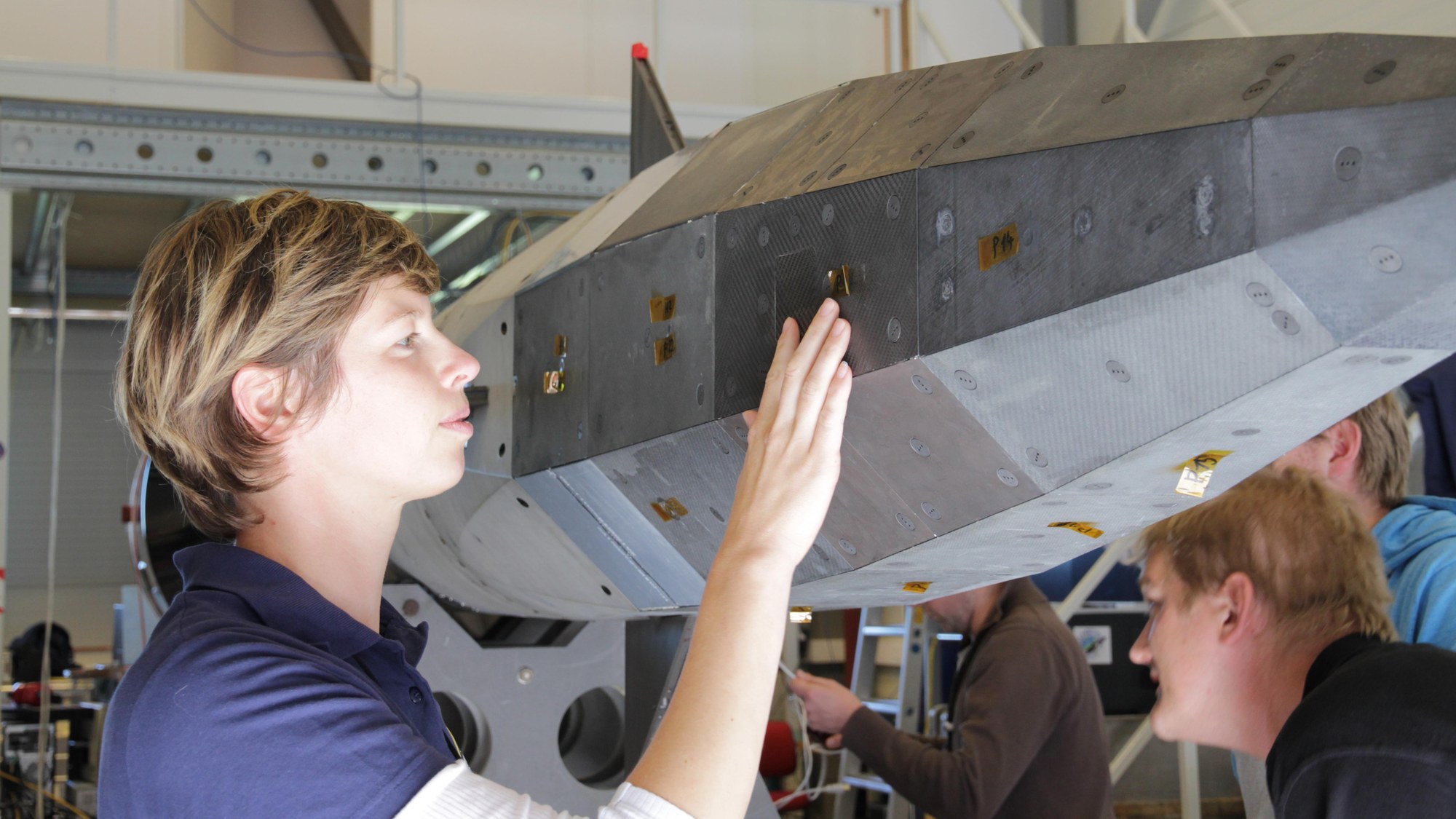 DLR-Wissenschaftlerin Hannah Böhrk untersucht die poröse Hitzekachel, durch die während des Flugs Stickstoff ausströmt. Das Gas legt sich wie ein Film über den Flugkörper Shefex II und bildet einen kühlt aktiv beim Wiedereintritt.