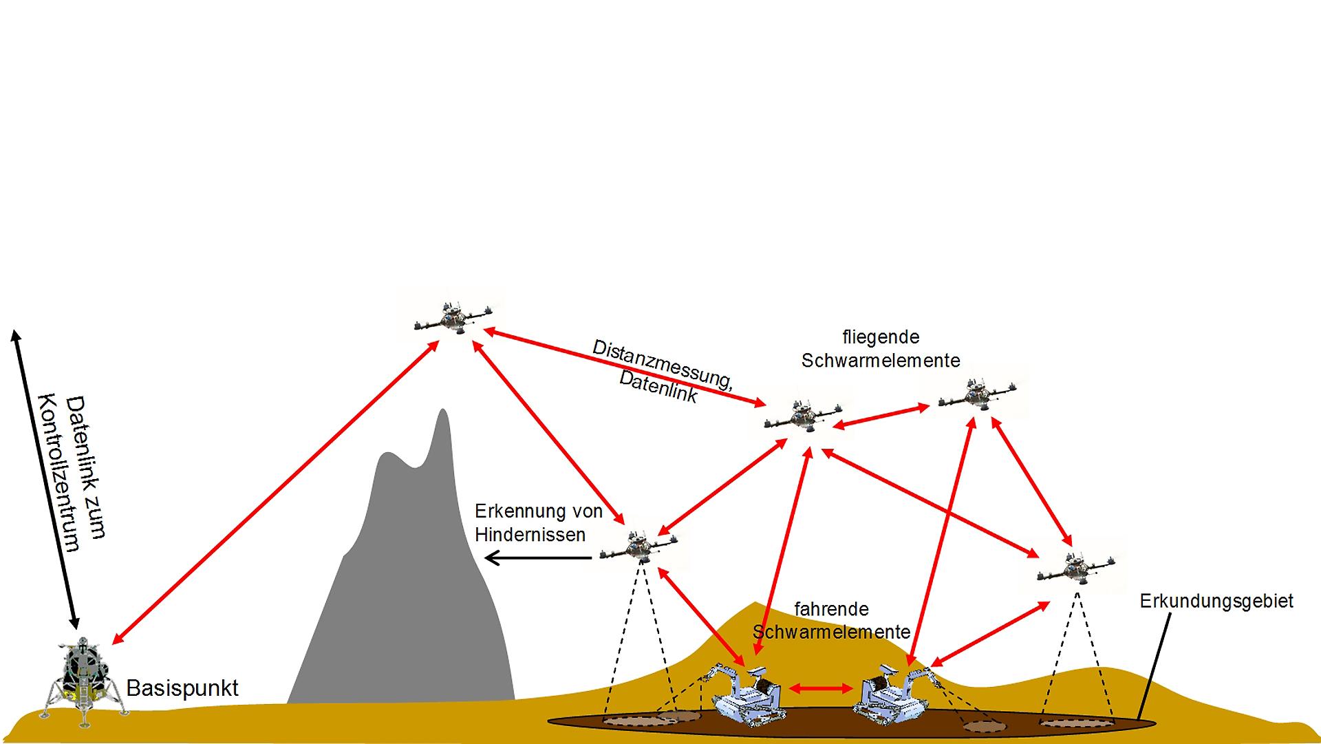 Einzelne Schwarmteilnehmer verständigen sich untereinander und geben die aktuellsten Daten über das Terrain untereinander weiter. Eine Bodenstation sendet alle relevanten Daten dann zur Erde weiter.